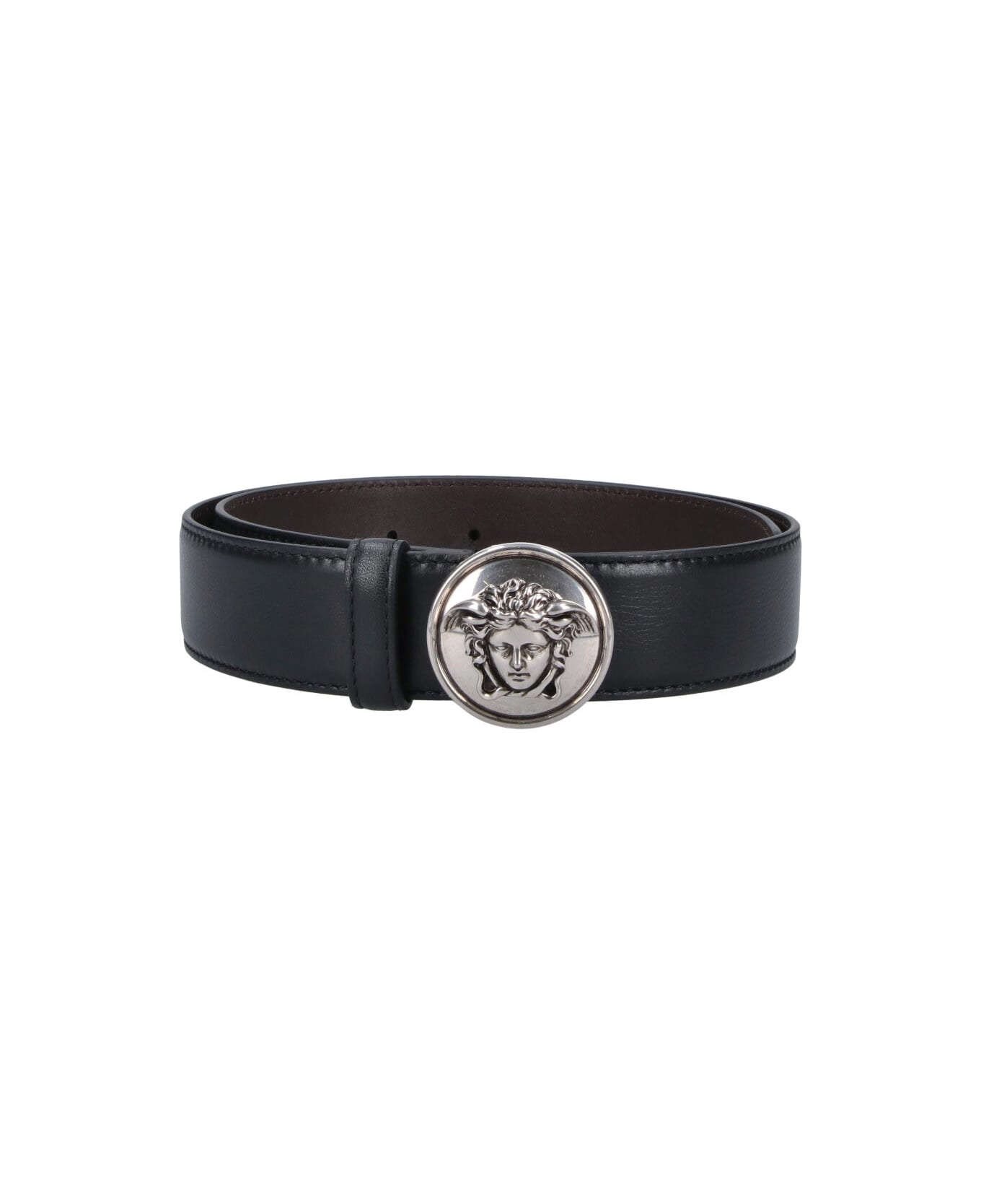 Black calf leather 'Medusa Biggie' belt, silver metal 'Medusa' logo buckle, adjustable. Composition: 100% Calf Leather