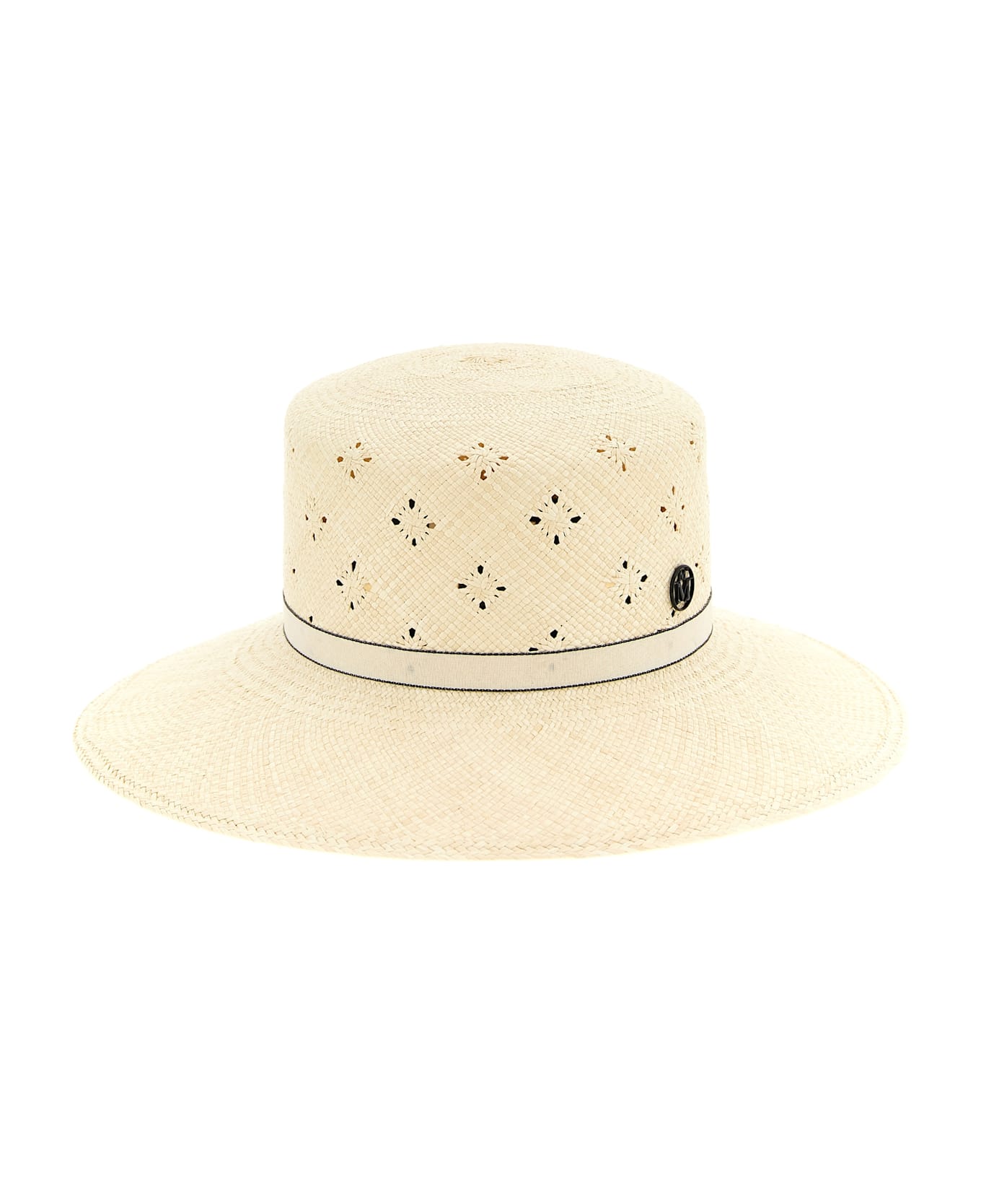 Ludi' hat in naturally woven straw with carvings, cloche model, grosgrain ribbon, front metal logo. Handcrafted product, any imperfections are to be considered characteristics of uniqueness.