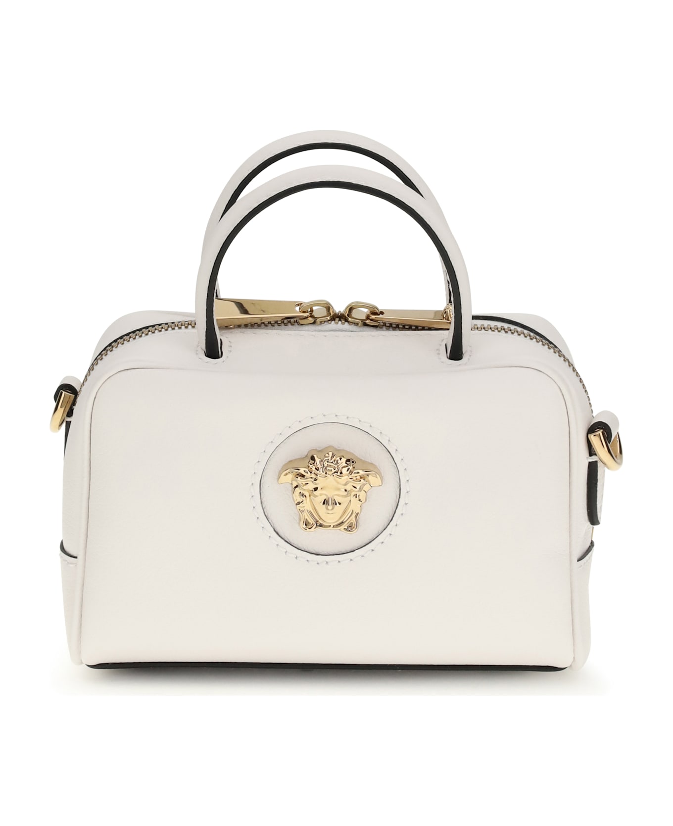 The boston la medusa mini handbag by versace is made of grained calfskin and embellished with the iconic three-dimensional la medusa accessory, the house's emblem. double round handles lend structured elegance, while the removable leather shoulder strap allows it to be worn either hand-held or crossbody. the top two-way zipper closure ensures practicality, complemented by an inside pocket and a back pocket useful for organizing daily essentials. a compact and distinctive model, perfect for adding a versace touch to any look.