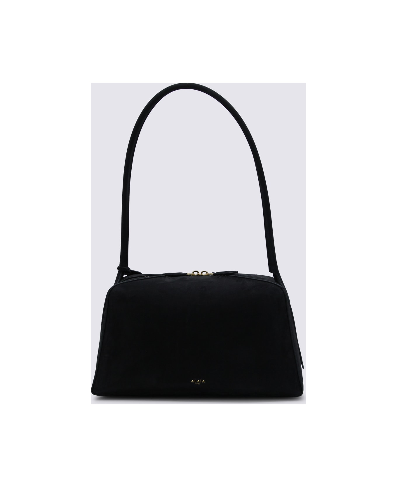 Black leather Le Bulldog shoulder bag from Alaia featuring diagonal handle with decorative laces, double zip closure, main compartment and embossed logo.