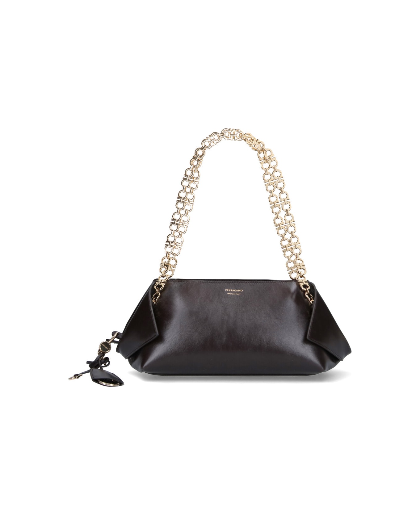 Ferragamo logo shoulder bag in dark brown calf leather with gold metal "Gancini" shoulder strap, double zip and magnetic flap closure, removable charm and keyring detail, folded side panels, gold logo print on the front, and main inner compartment.