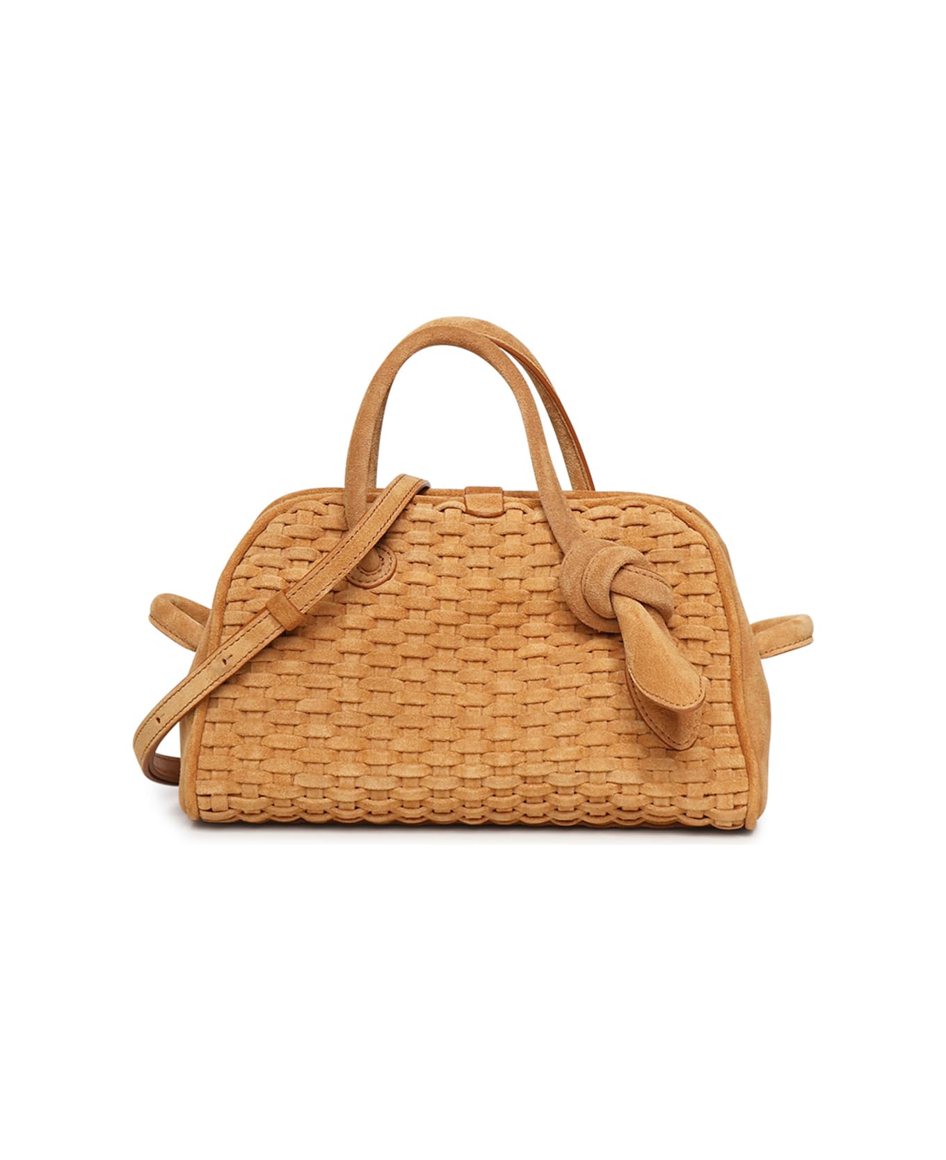 - Made of woven leather - Top handles - Zip closure - Interior pocket - Adjustable and removable shoulder strap - Dimensions: 26 x 16 x 11 cm - Made in Italy - Color: Camel