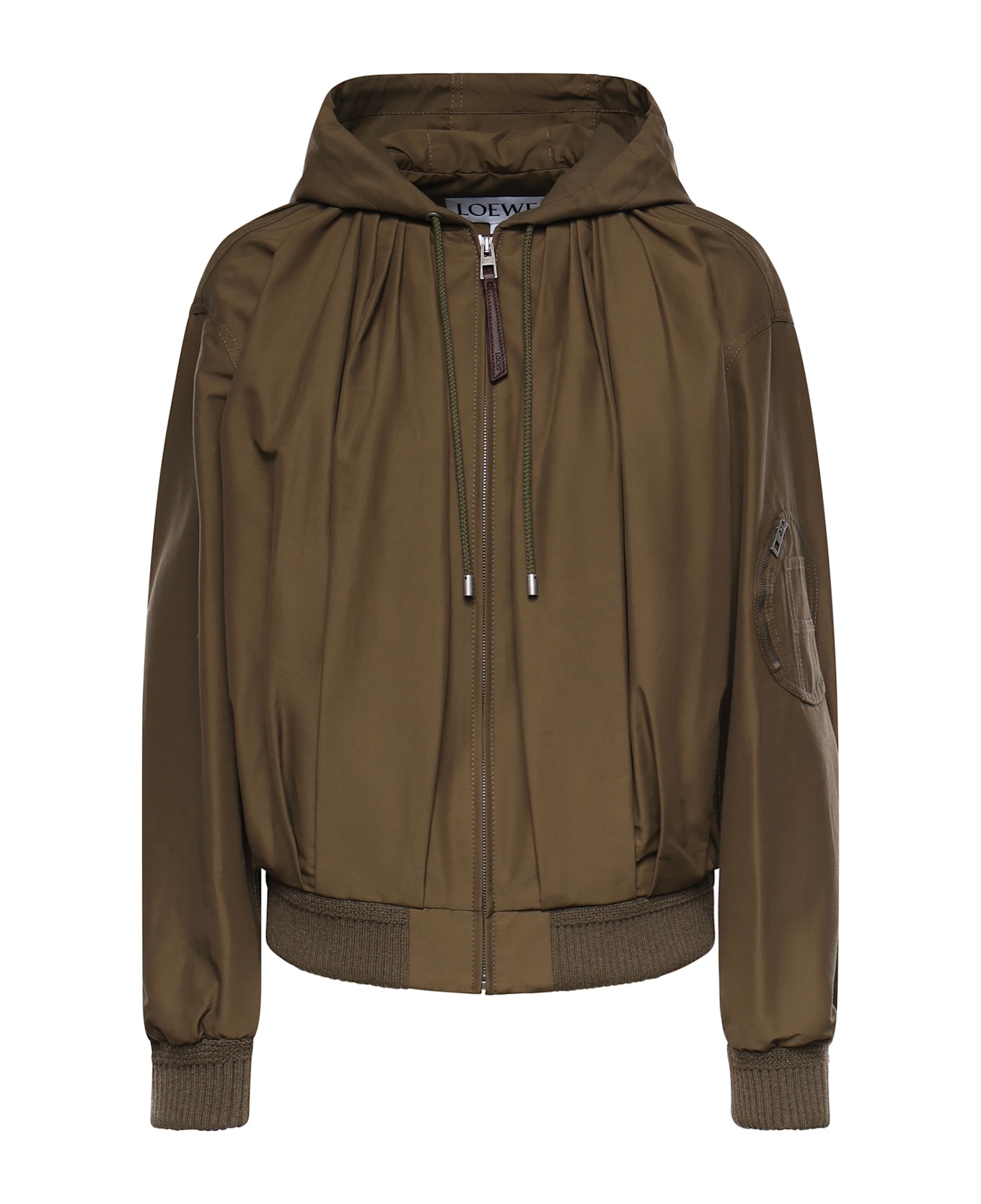 - Made of a technical cotton blend - Front zip closure - Drawstring hood - Ribbed hem and cuffs - Regular fit - Size shown is 36 - Made in Italy - Color: Khaki Green