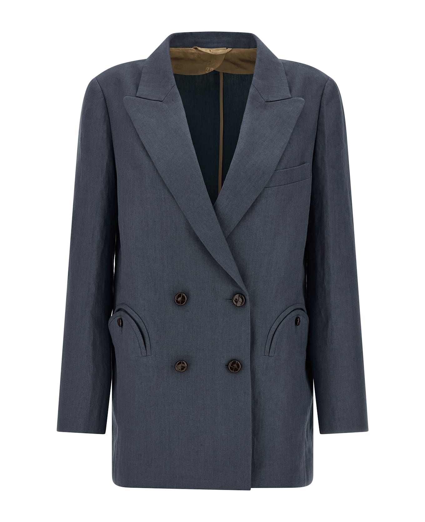 'Midday Sun Everyday' double-breasted linen blazer with peak lapels, front closure with shiny buttons, breast pocket, 'Smiley' pockets, four inner pockets, long sleeves, structured shoulder strap, back split, monogram viscose lining.