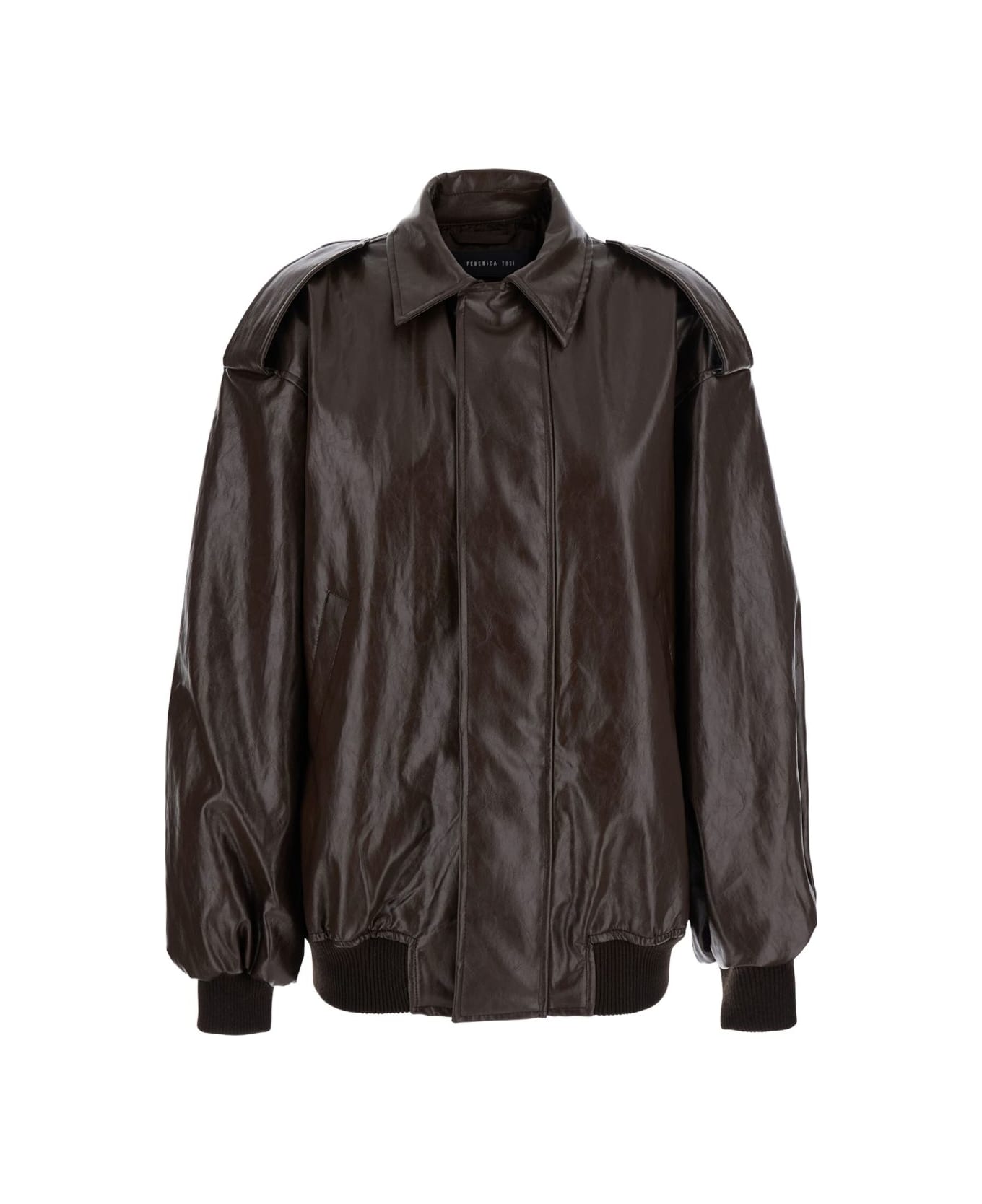 Federica Tosi Leather bomber brown leather shoulder epaulettes classic collar concealed front fastening ribbed cuffs long sleeves