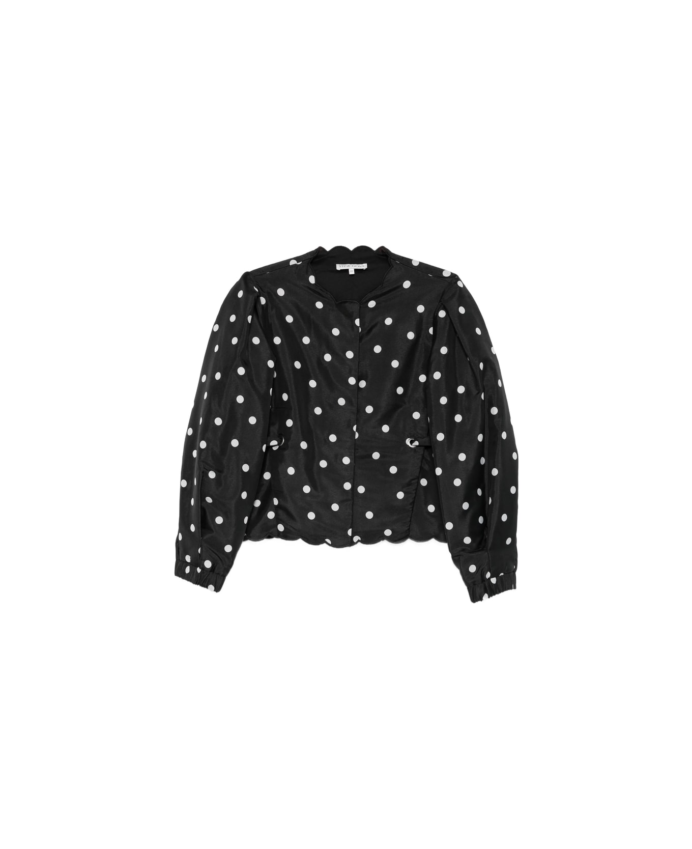 black polka dot pattern scalloped hem round neck long sleeves concealed front button fastening
