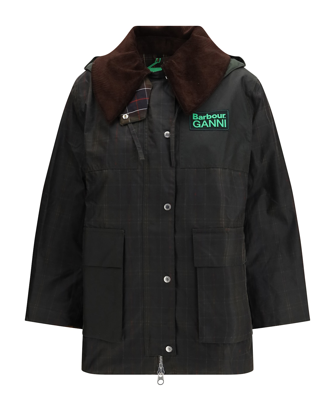 The tartan waxed duffle coat by barbour x ganni introduces a new silhouette to the collaboration, designed for colder seasons. crafted from barbour s signature waxed cotton, it features tonal elbow patches and a tartan lining throughout the body and hood. the design is elevated with ganni s signature oversized collar finished with barbour corduroy, and completed with a co-branded silicone patch on the chest. a timeless coat blending barbour s british heritage with ganni s contemporary scandi aesthetic.