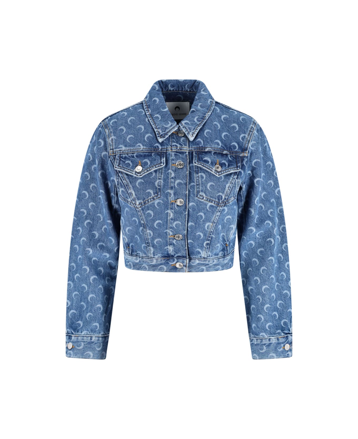 Marine Serre 'Moon' crop jacket in light blue cotton denim with classic collar, button closure, two front button pockets, all-over contrast 'moon' logo pattern, leather logo patch at the back, button cuffs, straight hem. Composition: 100% Cotton