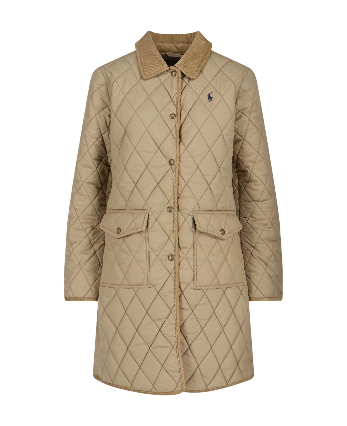 Polo Ralph Lauren quilted jacket in beige fabric with classic brown velvet collar, contrast logo embroidery on the front, button closure, long sleeves, two front button pockets, straight hem.