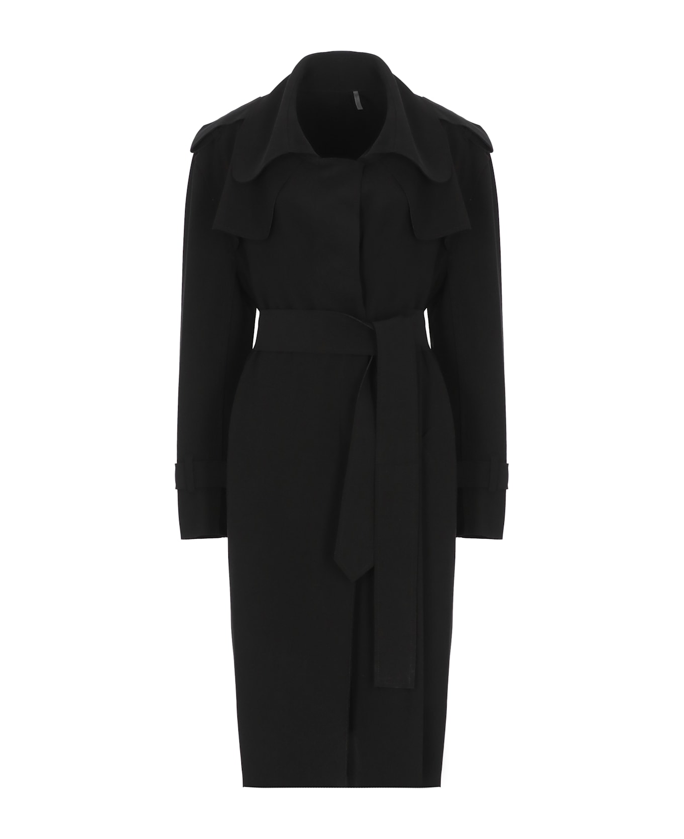- Norma Kamali woman's black trench - Lapel collar - Belt loops - Matching belt included - Two side slit pockets - Long sleeves - Rear vents at hem Composition: 95% Polyester, 5% Spandex