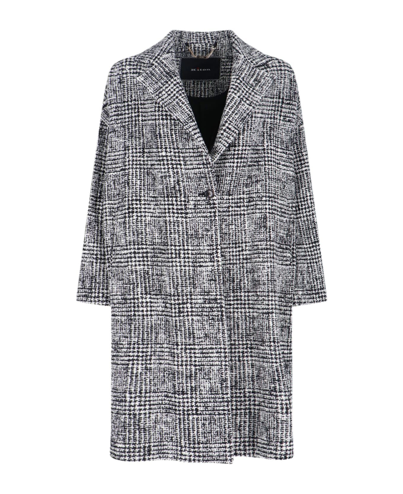 Kiton single-breasted coat in black and white wool blend with classic lapels, button closure, two side pockets, back split detail, straight hem. Composition: 67% Wool, 23% Alpaca, 10% Polyester