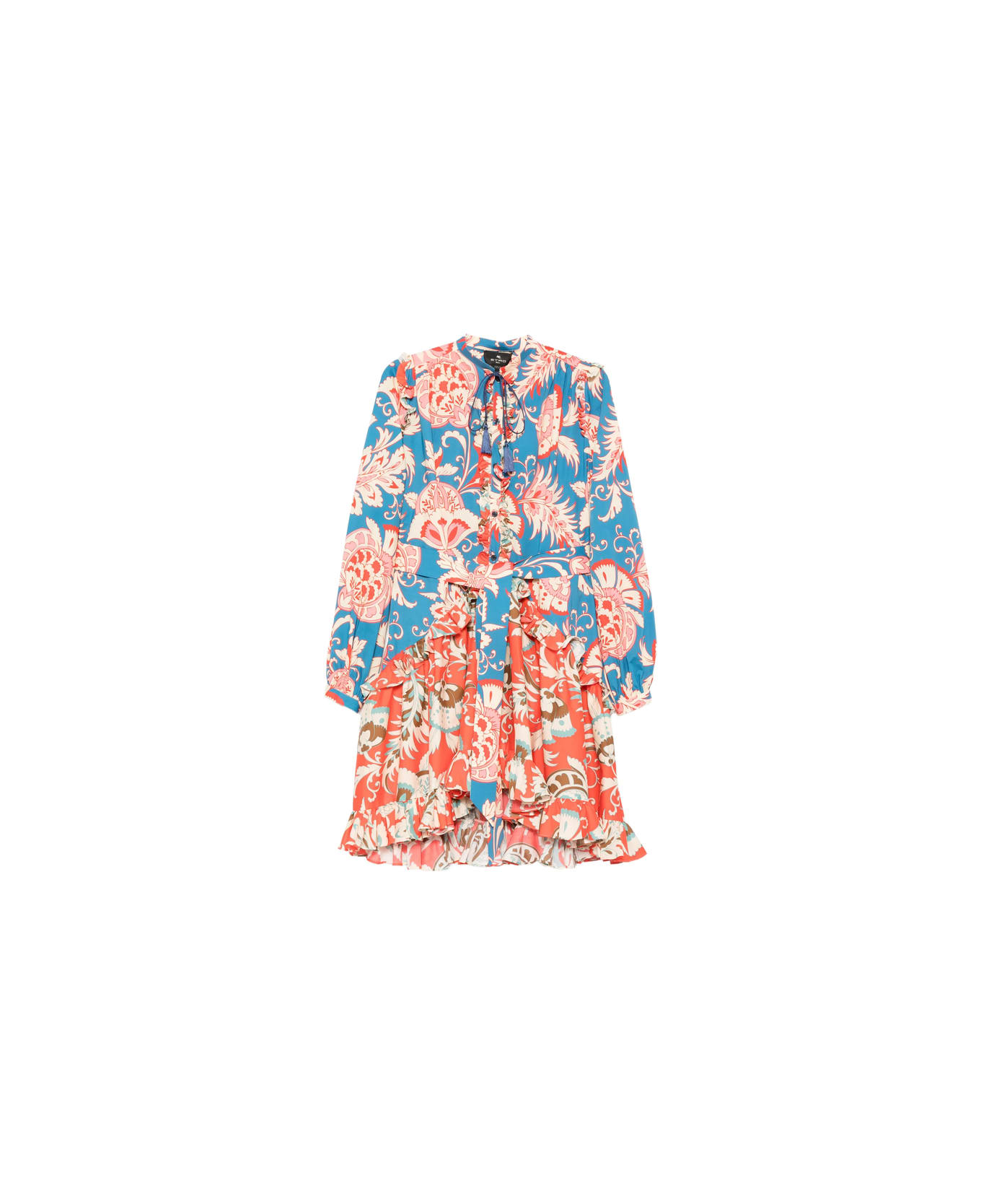 light blue/orange floral print ruffled details button fastening tie detail long sleeves