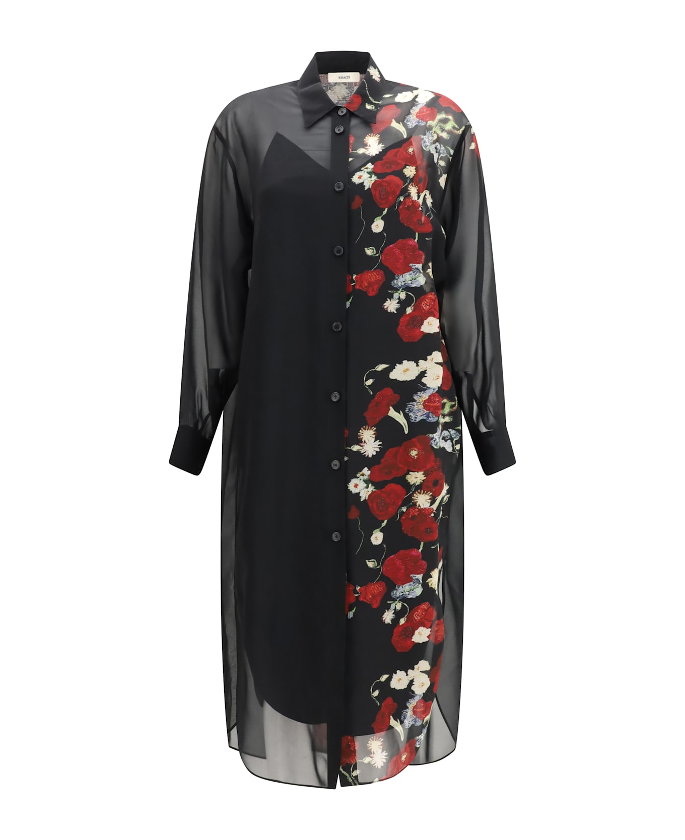 The gloria dress by khaite draws on the relaxed elegance of men s shirting, reimagined through a softened, fluid silhouette. a curved back forms a subtle cocoon shape, enhanced by dropped shoulders and an extended shirttail hem with side slits. tailored details such as the back yoke and single-button cuffs refine the design. the dress comes with a slip, adding coverage while maintaining its airy, effortless character.