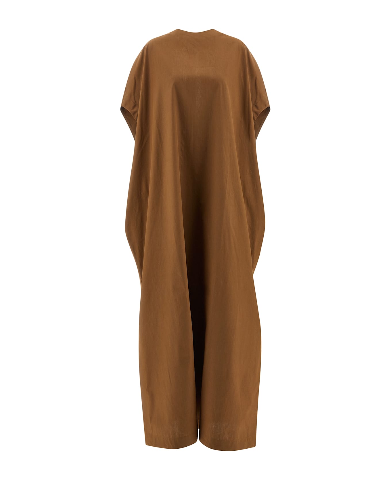 Long 'Nicla' dress in cotton poplin, caftan style, back V-neck with tie ribbon, wide short sleeves with dropped shoulders and asymmetrical cuffs, wide side slits, pockets, unlined.