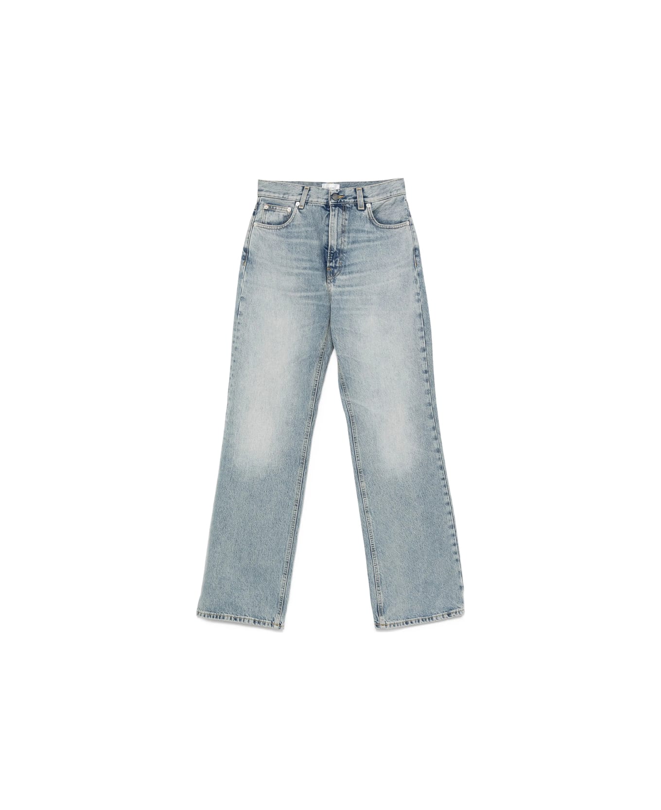 blue cotton five-pocket styling button fly