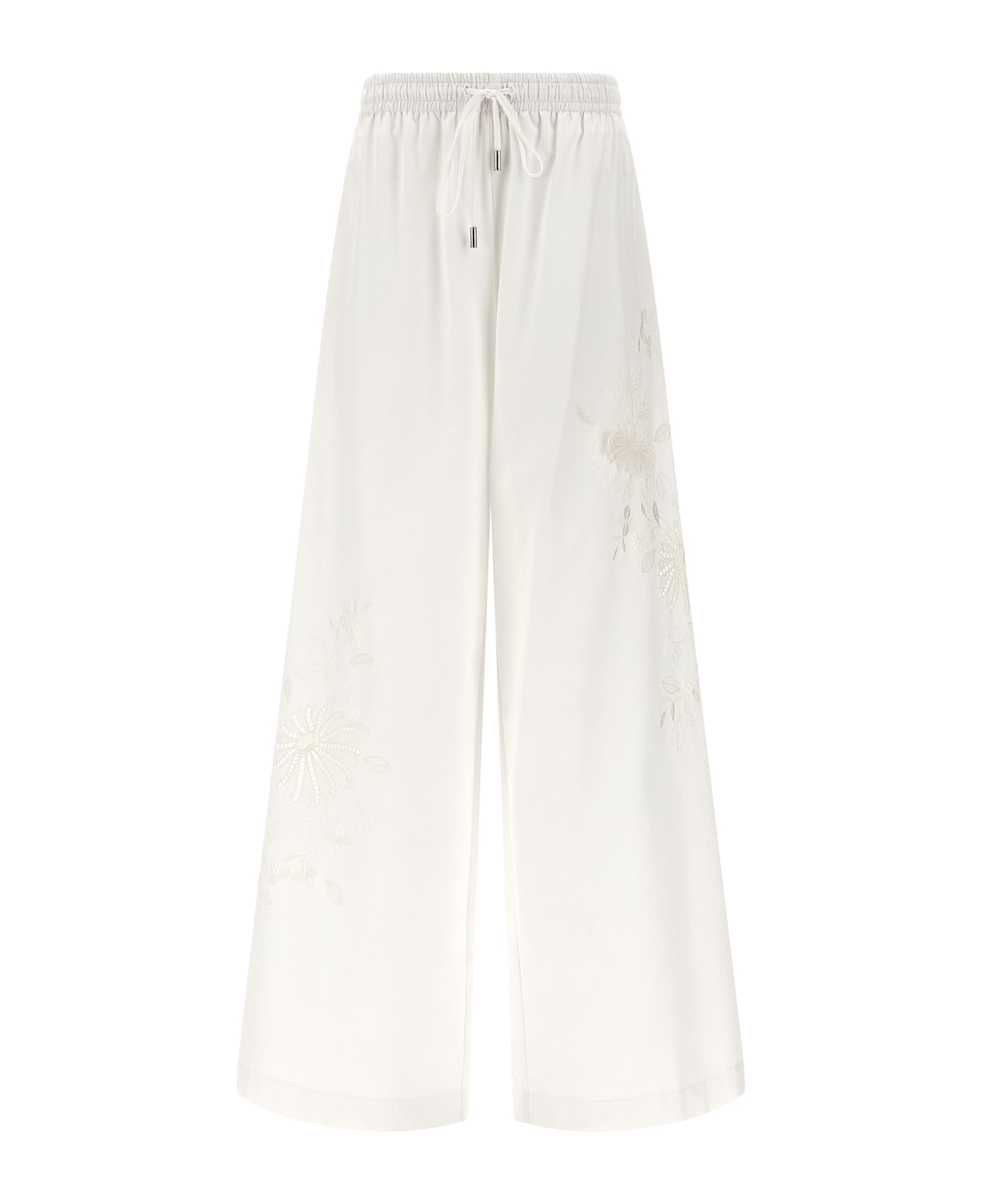 Stretch silk trousers with tone-on-tone lace inserts to create a I don't see effect, pajama model, elastic with drawstring at the waist, wide and straight leg, pockets. Composition: 100% cotton