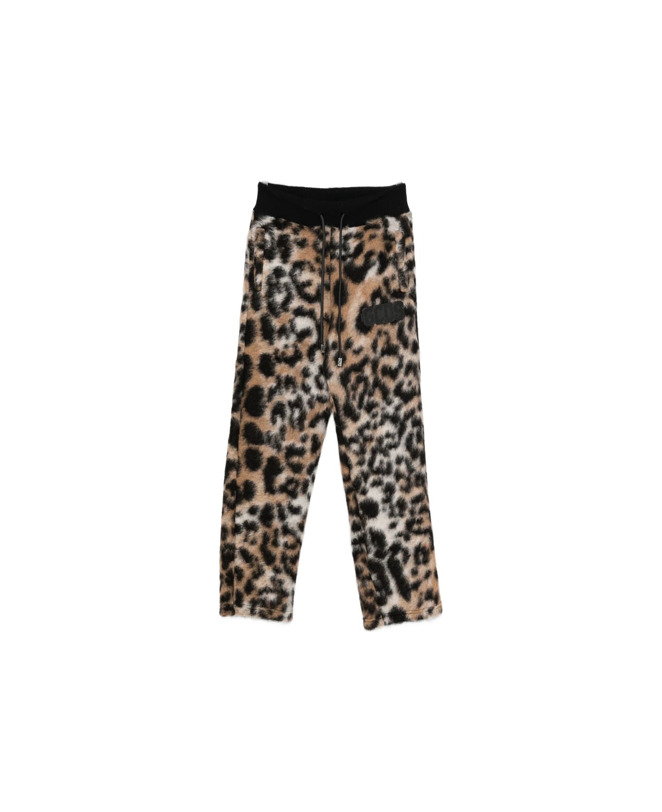 brown leopard print drawstring fastening logo patch ribbed waistband metal hardware