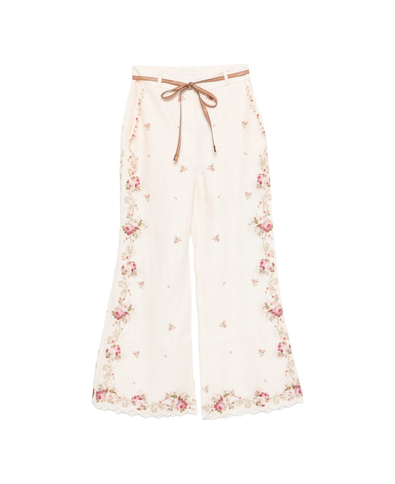 cream floral print embroidered detailing belt scalloped hem