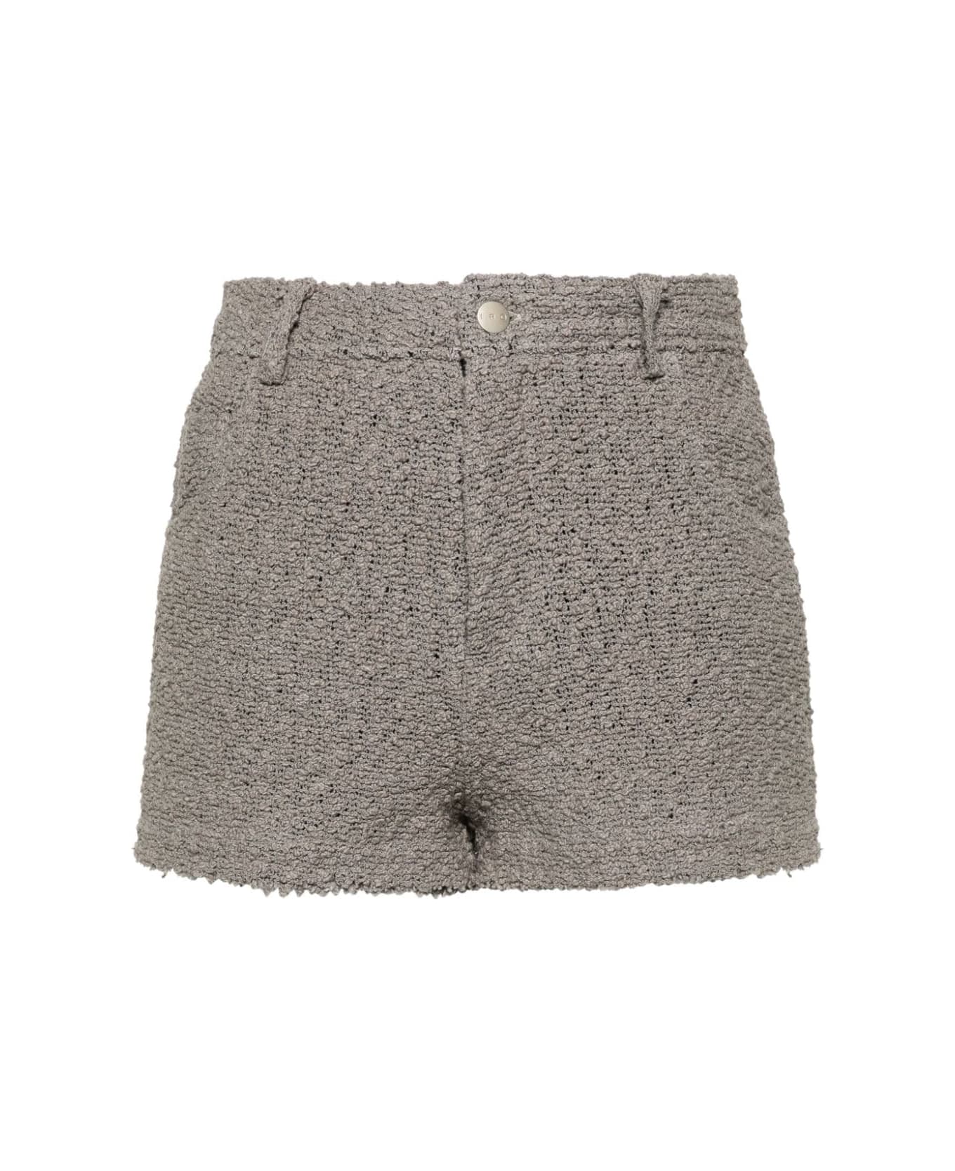 light grey cotton blend bouclé construction high-waisted belt loops front button and zip fastening classic five pockets frayed hem thigh-length