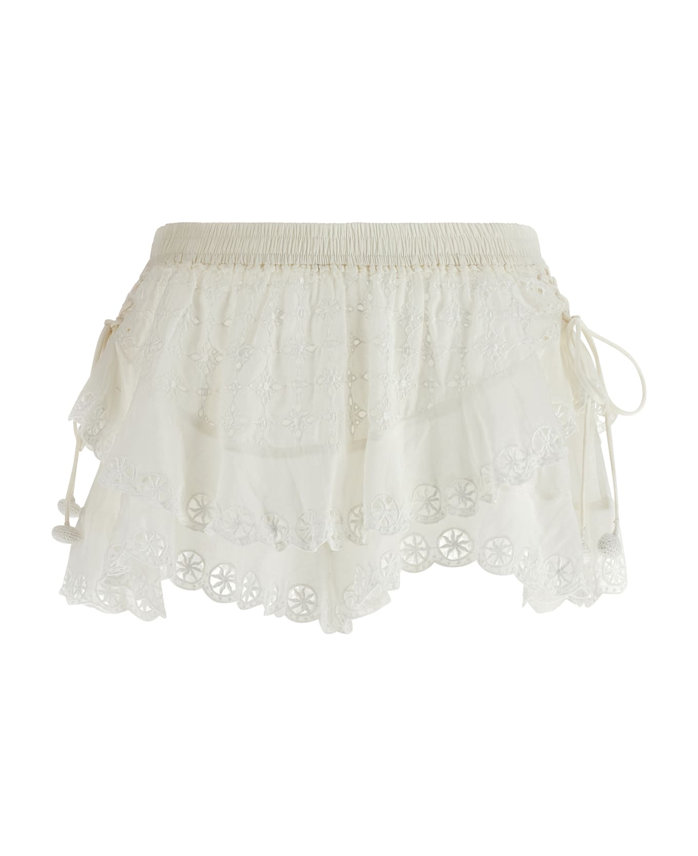 'Neis' cotton shorts, skort model with cotton and lace ruffles with embroideries, elastic waistband, lanyards on the sides to be tied with ponpons. Composition: 73% cotton, 27% silk