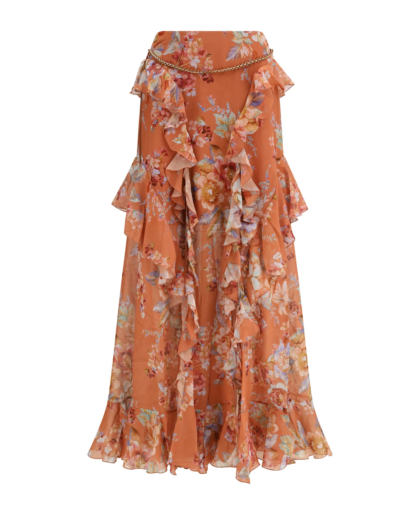 The long ruffle skirt by zimmermann, crafted from a cotton-silk blend, features a mid-rise waist and symmetrical ruffle details that enhance the design. the voluminous gathering and front slits add a dynamic touch, while the removable rope belt with tassels at the ends completes the look. an elegant and versatile piece, perfect for creating a sophisticated and feminine look.