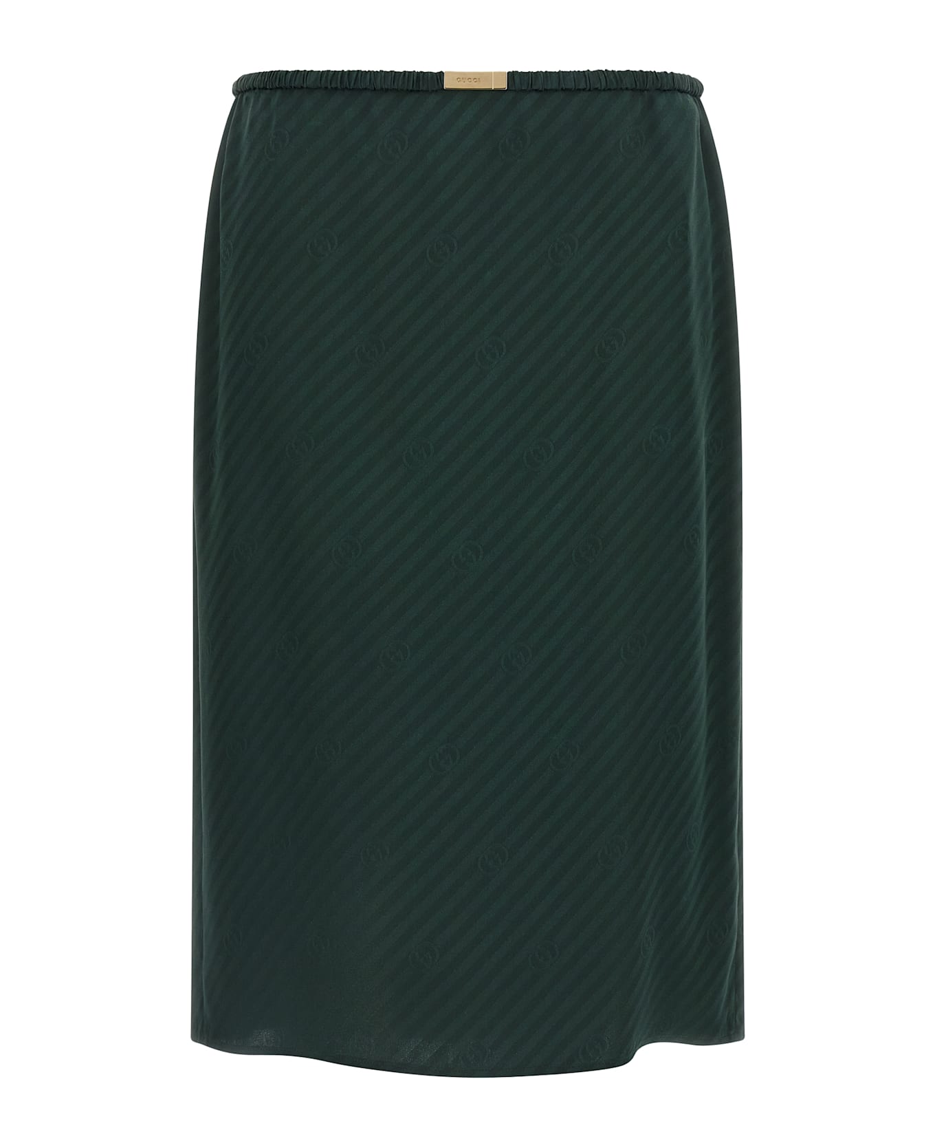 Logo knit silk midi skirt, curled elastic waistbelt with metal buckle and logo, side pockets, back central split.