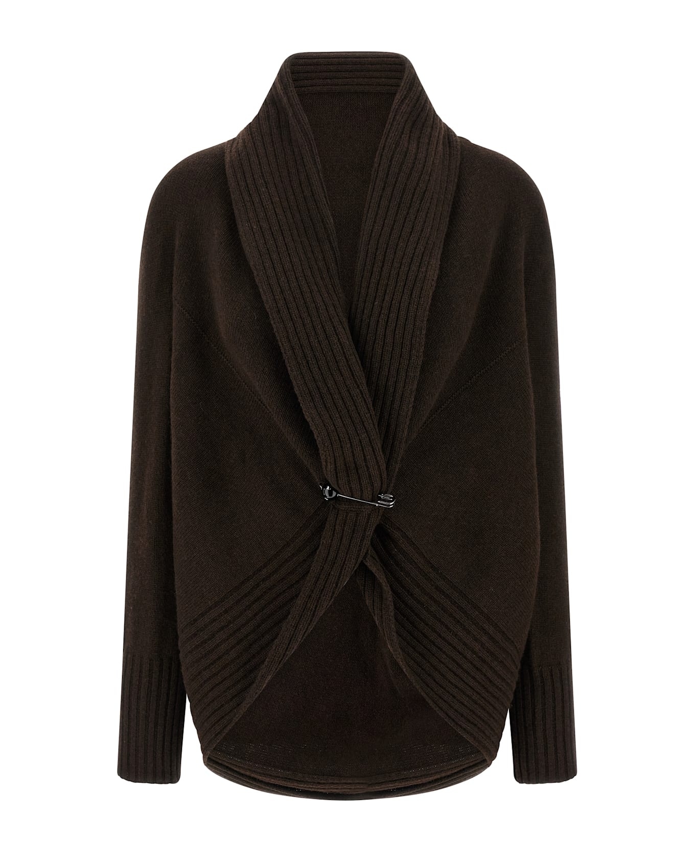 Merinos, silk and cashmere wool blend cardigan, shawl collar with hood, dressing gown style with removable front brooch detail, long sleeves. Composition: 55% virgin wool 30% silk 15% cachemire
