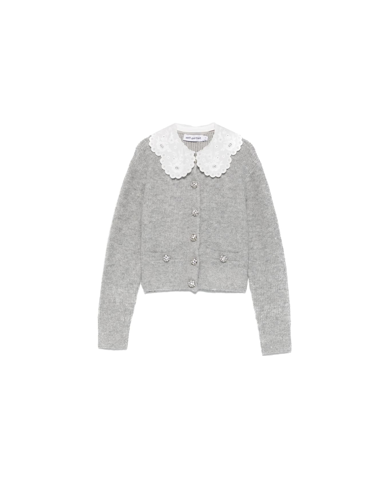 grey scalloped collar embellished buttons front pockets knit construction