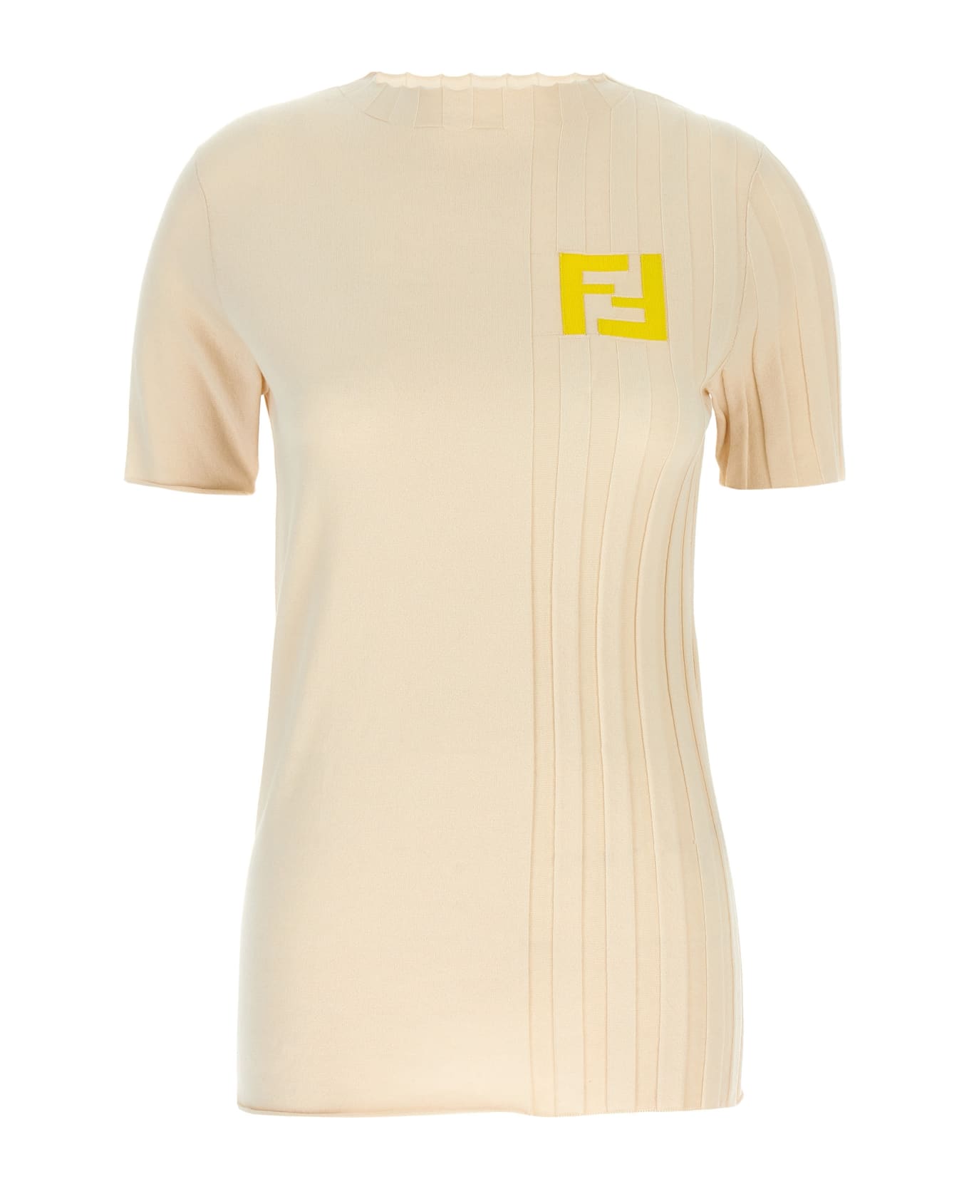 Cotton sweater with front inlaid 'FF' logo, asymmetrical ribbed pattern on the side, crew neck, short sleeves, raw cut hem. Composition: 100% cotton