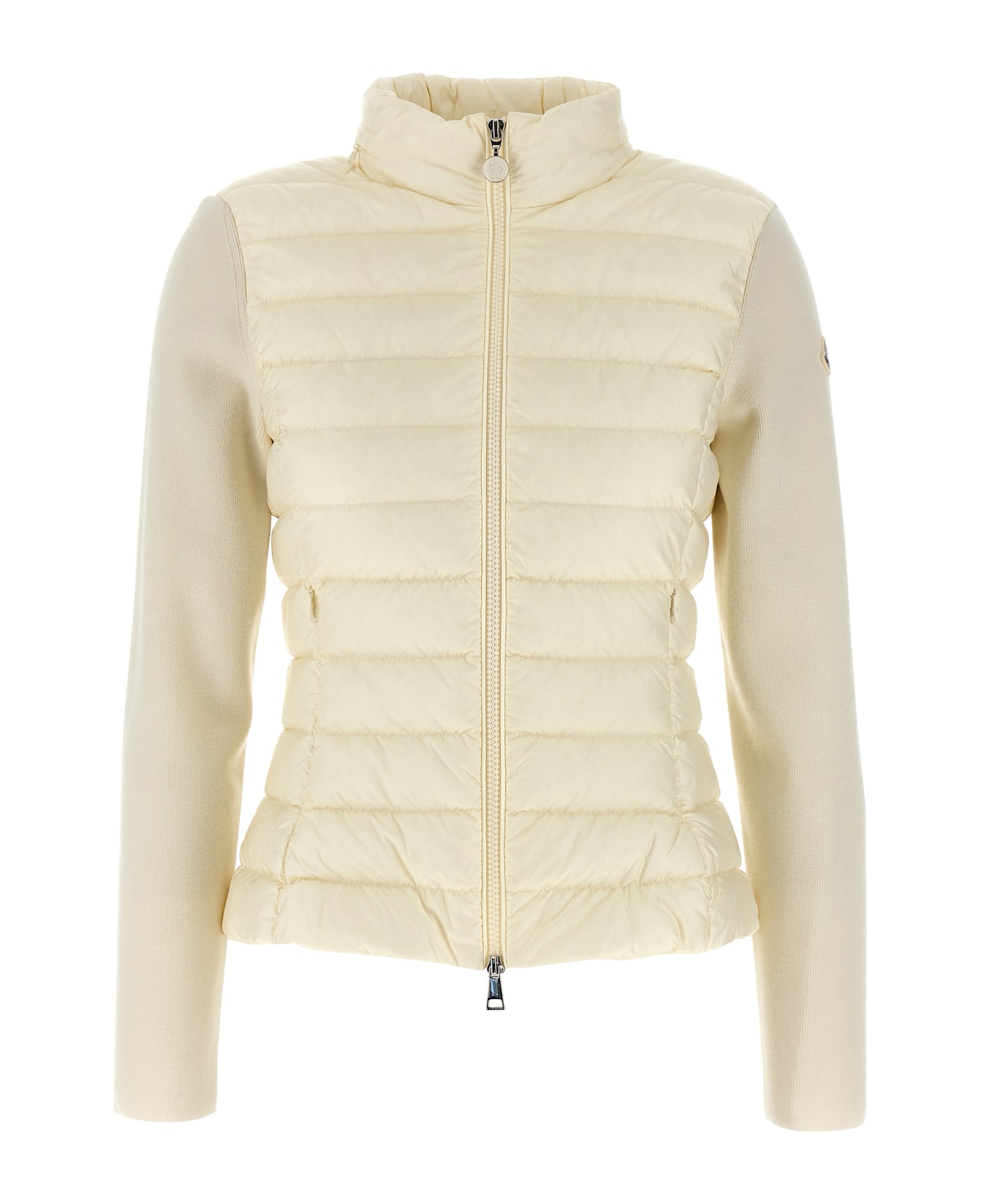Two-material nylon cardigan padded with feather and extra fine stretch merino wool, zip closure, pockets, standing collar with removable hood in saison longue, long sleeves with logo patch.