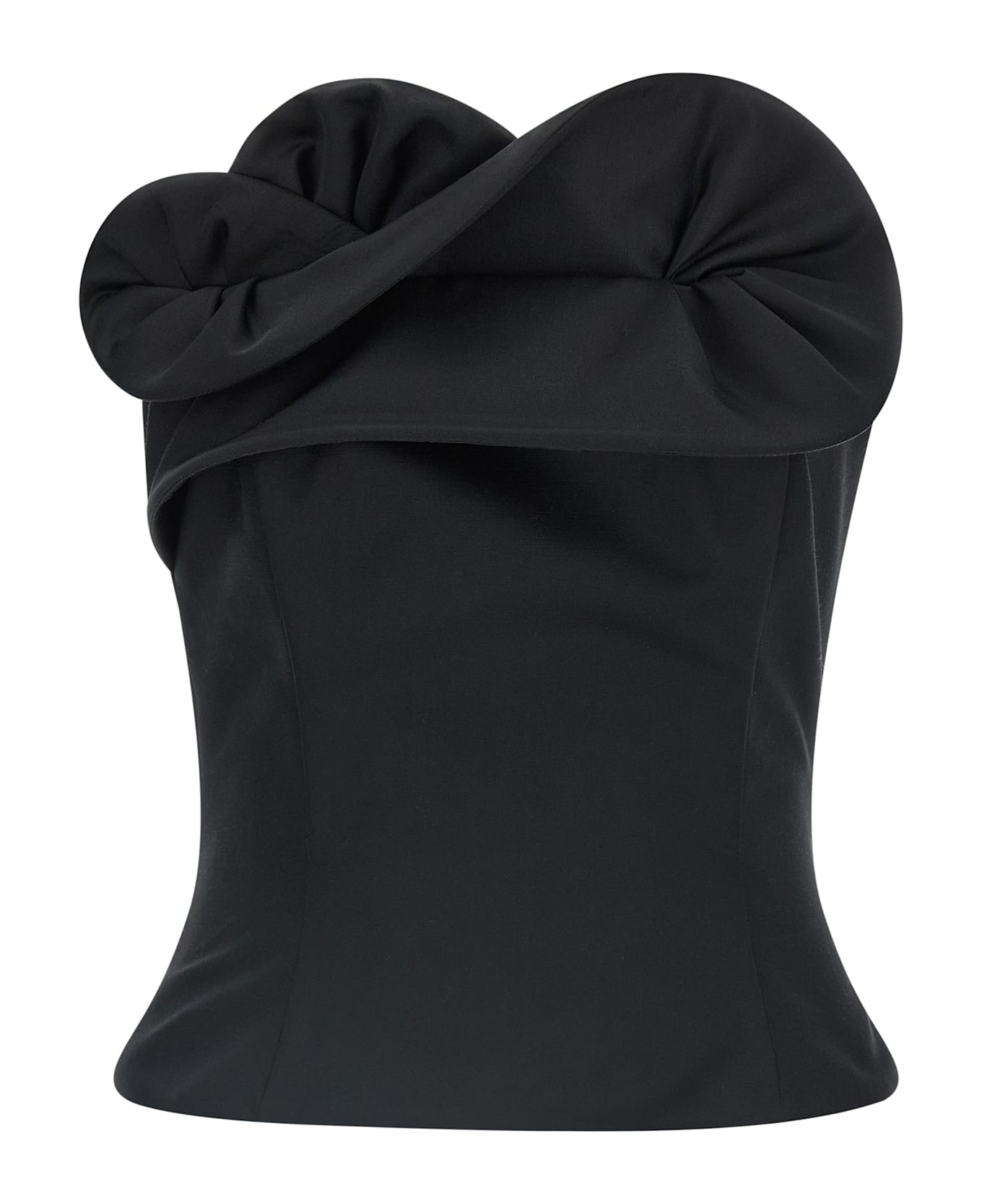 '01' off-the-shoulder corset top in wool and silk with front floral sculptural detail, inner slats, back zip closure, silk lining. Composition: 58% virgin wool, 42% silk