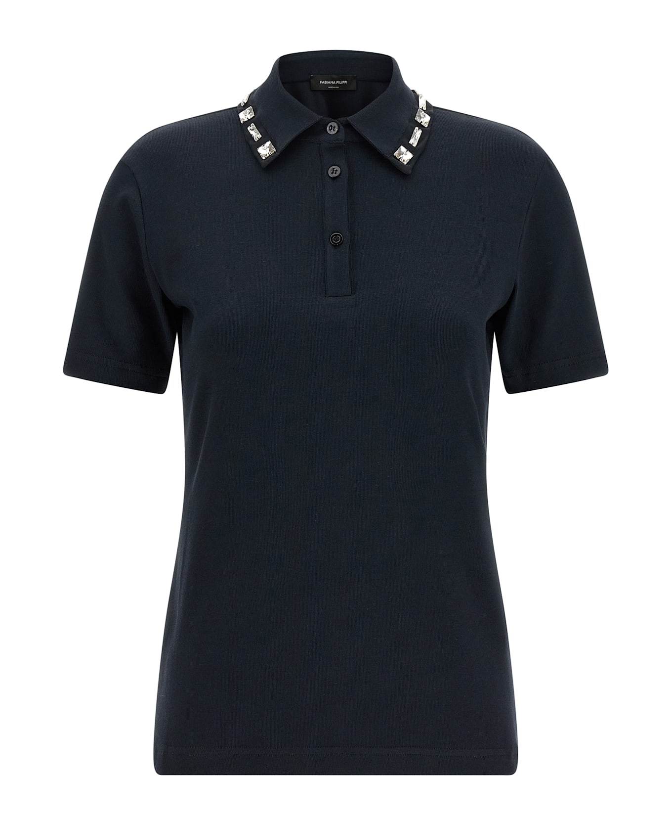 Polo shirt in stretch cotton, collar with organza piping and applied crystals, button closure, and short sleeves. Composition: 94% cotton 6% elastane