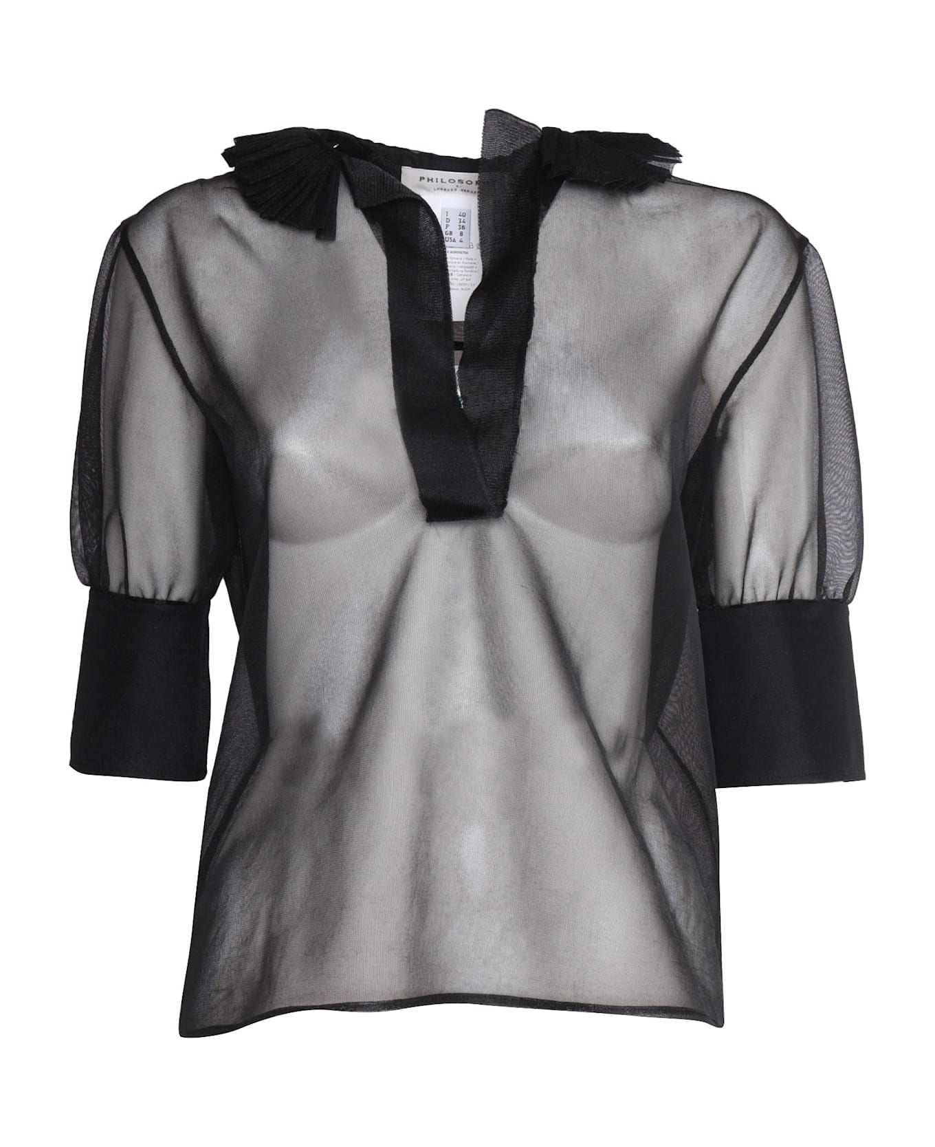 Another black crew in technical mix (70% polyamide, 30% polyester), with processing details that reflect the unmistakable style of the brand. A transversal garment, perfect for layering under blazer or above silk shirts for a sophisticated contrast.