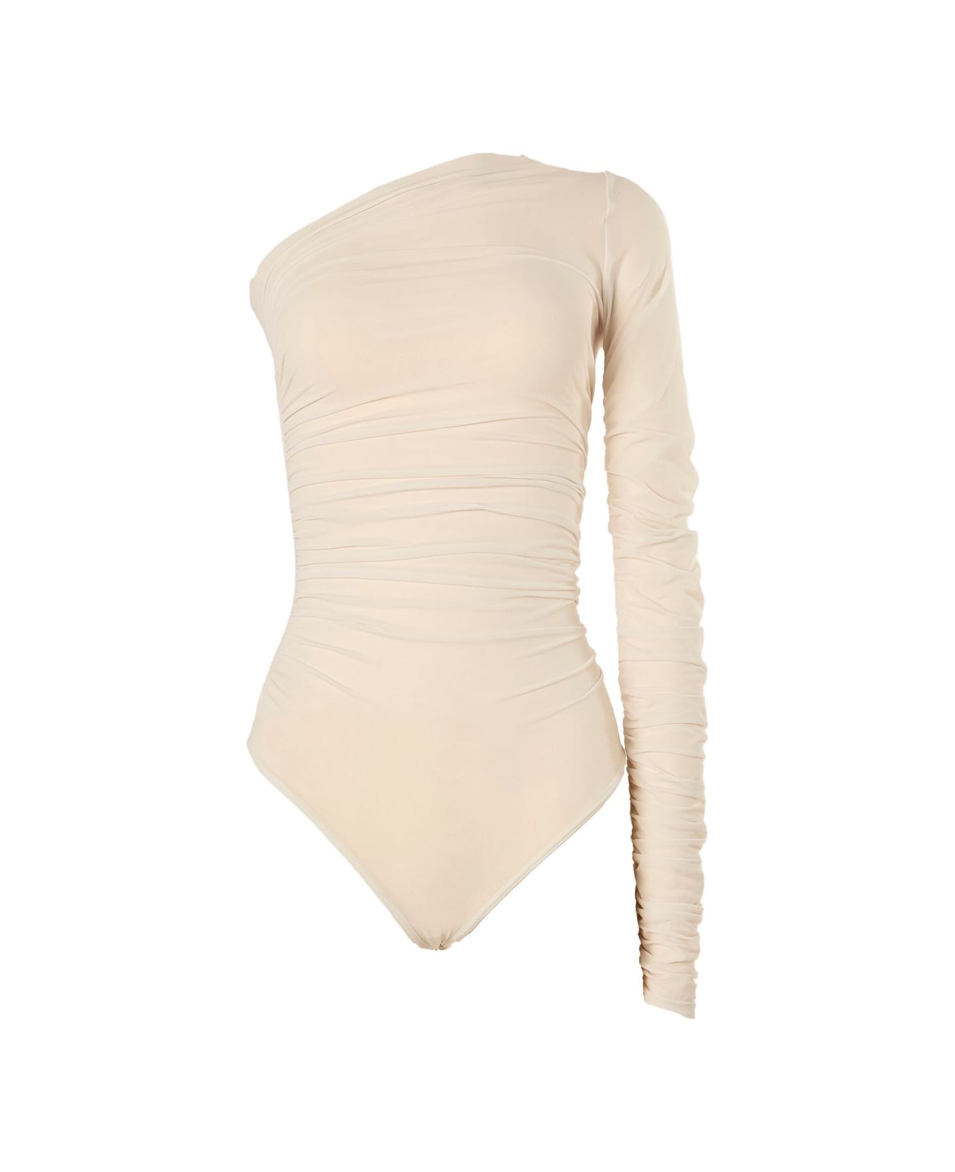 off-white one-shoulder design single long sleeve sheer finish draped detail thong cut