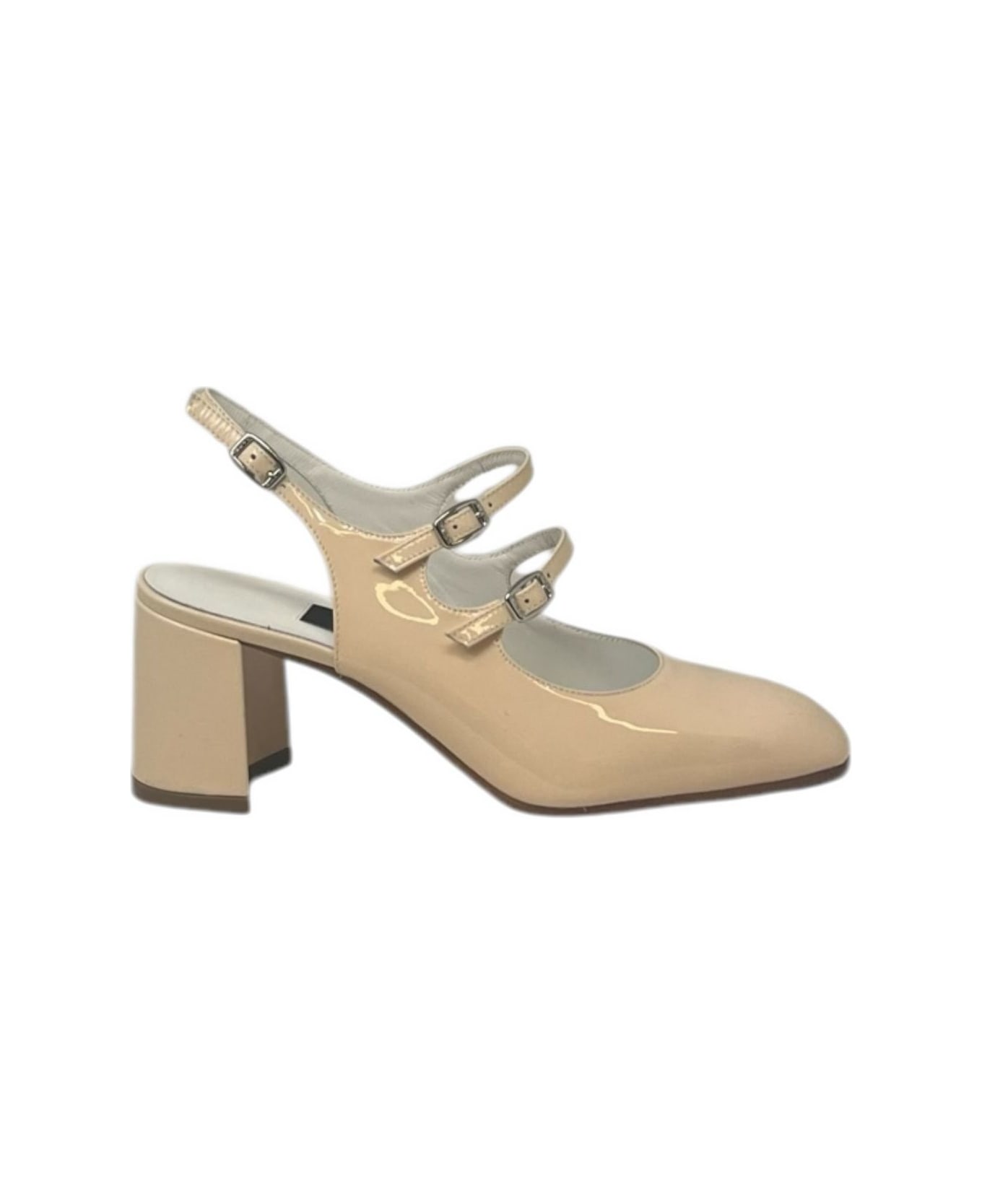 beige patent finish buckle-fastening straps block heel pointed toe slingback strap