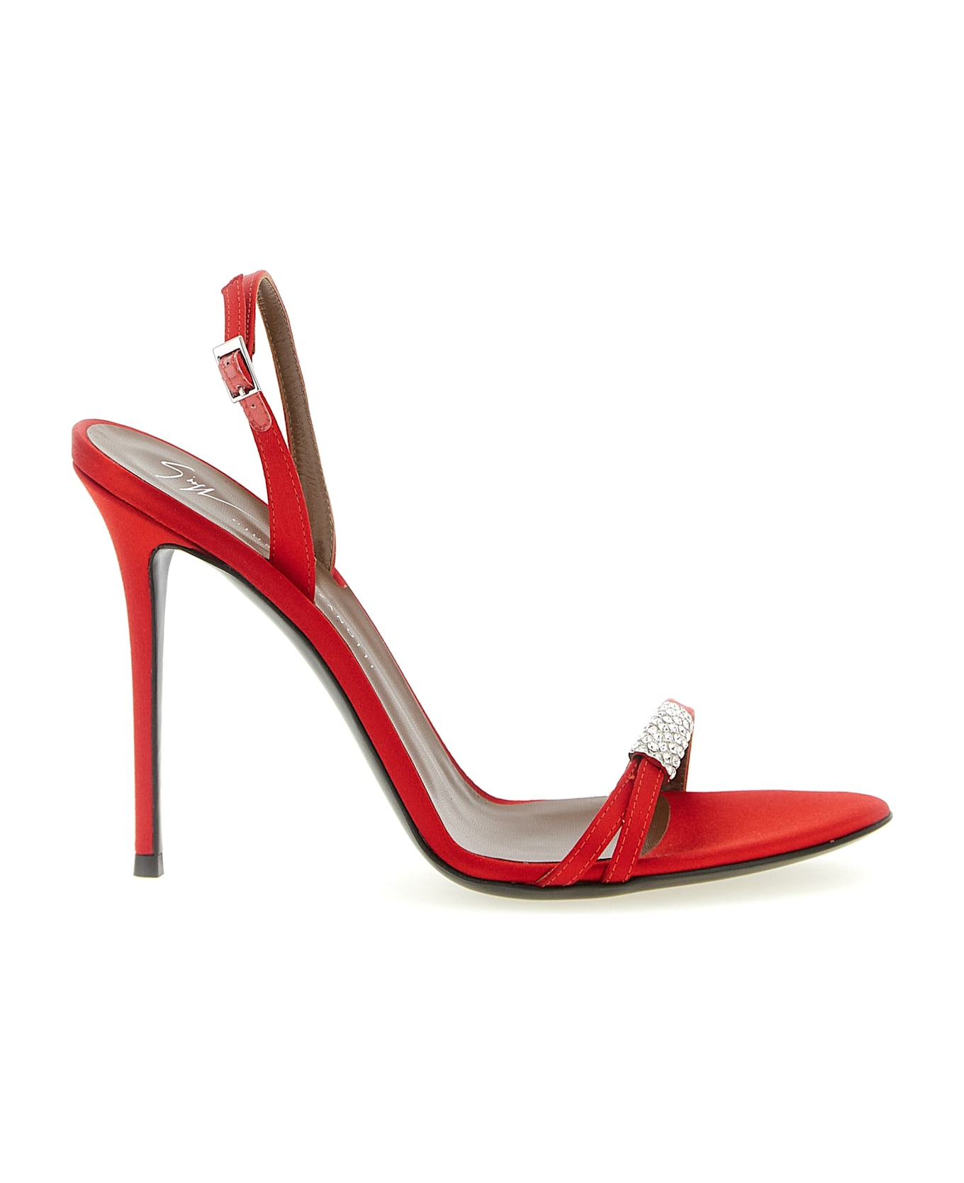 'Lena Crystal' silk satin sandals with cable band with metal detail and crystals on the front, almond toe, adjustable strap, stiletto heel, leather sole.