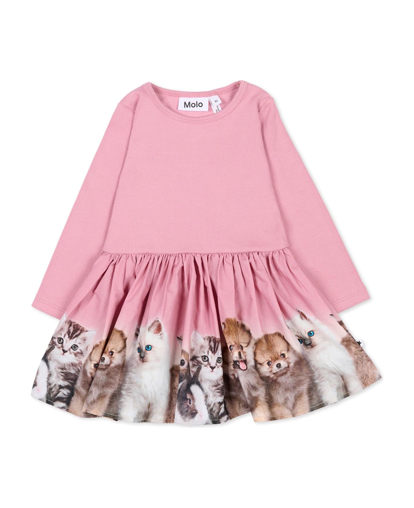 Pink GOTS-certified organic cotton blend dress with long sleeves, a crew neck, a ribbed bodice, and a poplin skirt. It is embellished with all-over animal print, on the skirt.