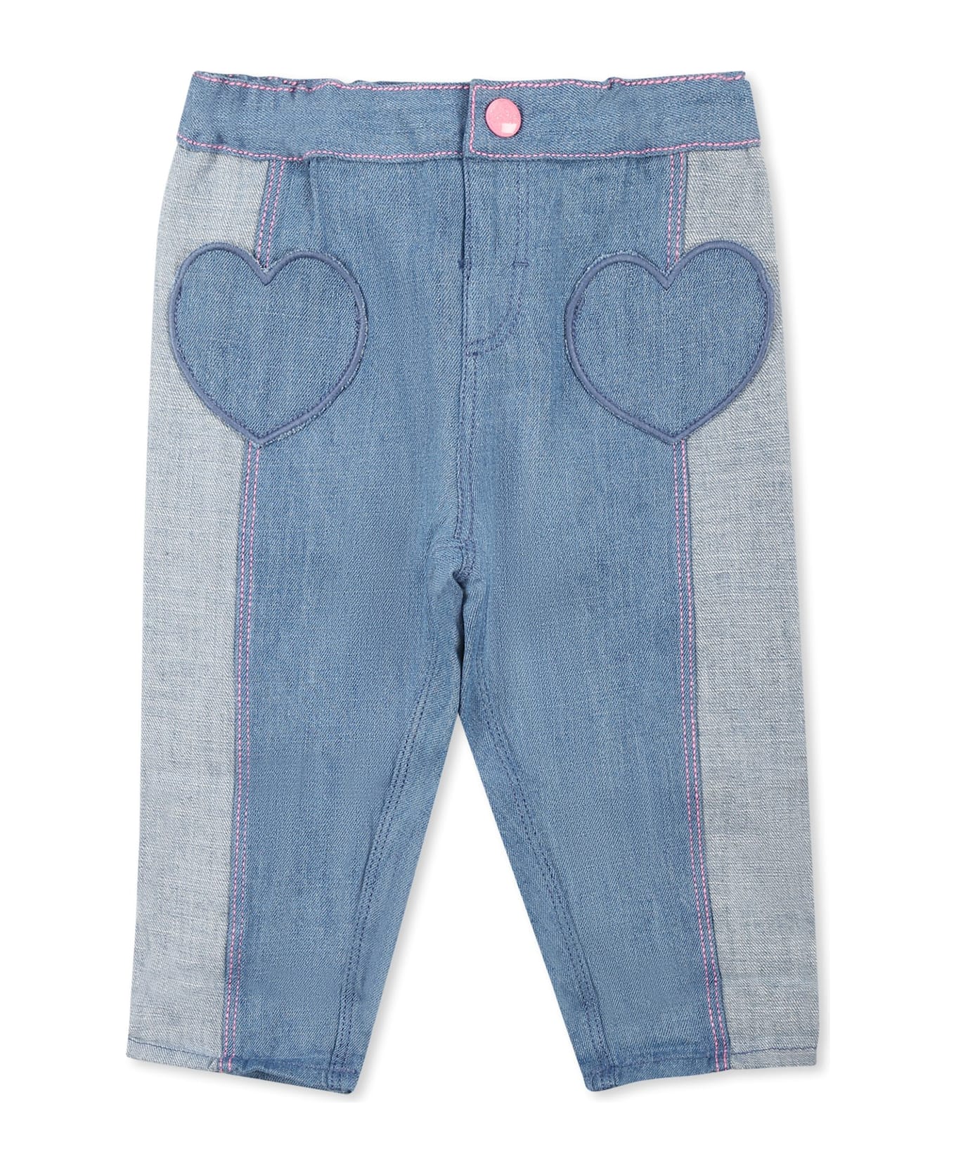Cotton denim jeans, with front snap button fastening, elastic on the back and heart-shaped pockets applied on the front. They are embellished with rubber logo patches on the back