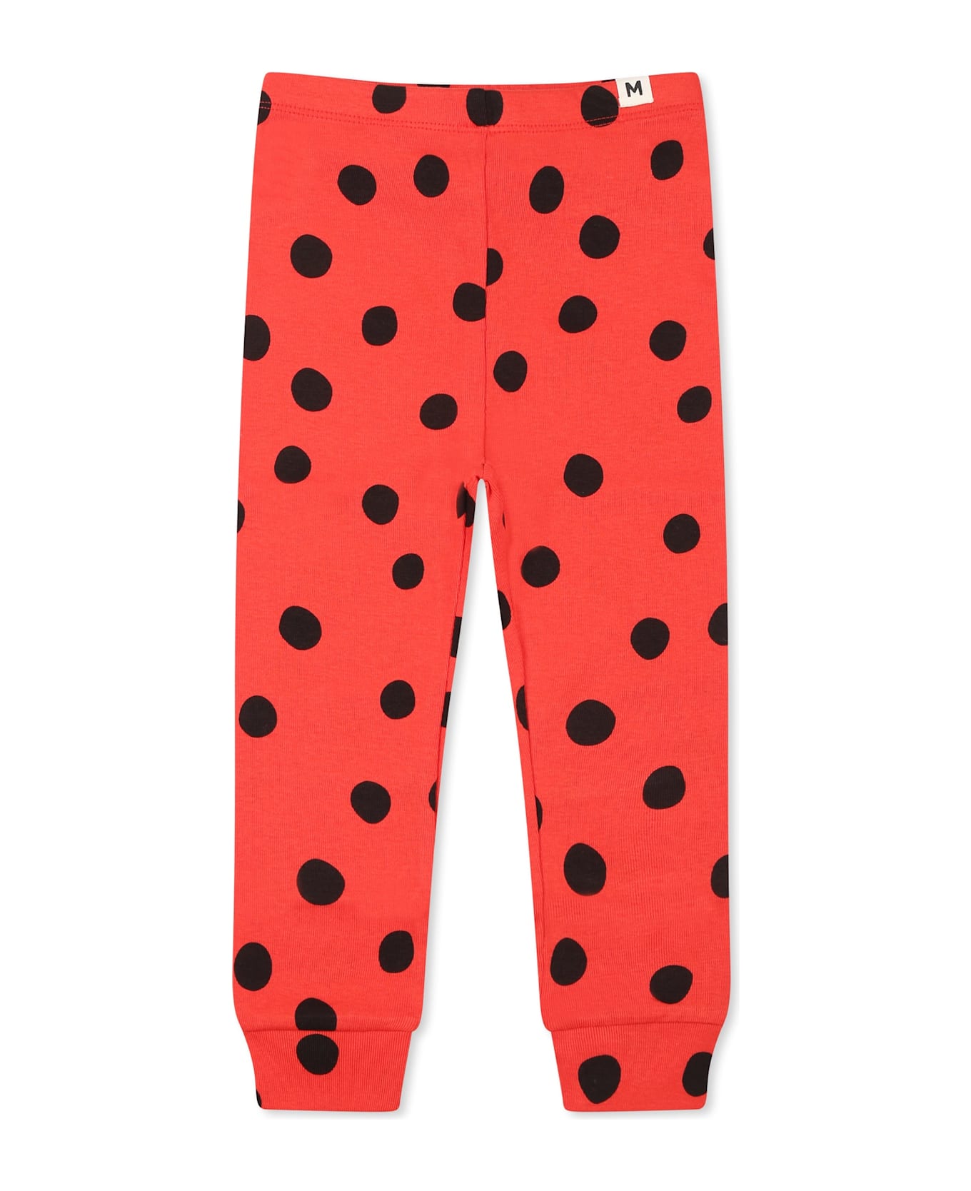 Red organic cotton leggings, with elasticated waist and ribbed ankles. They are embellished with all-over black polka dots and a logo patch on the front.