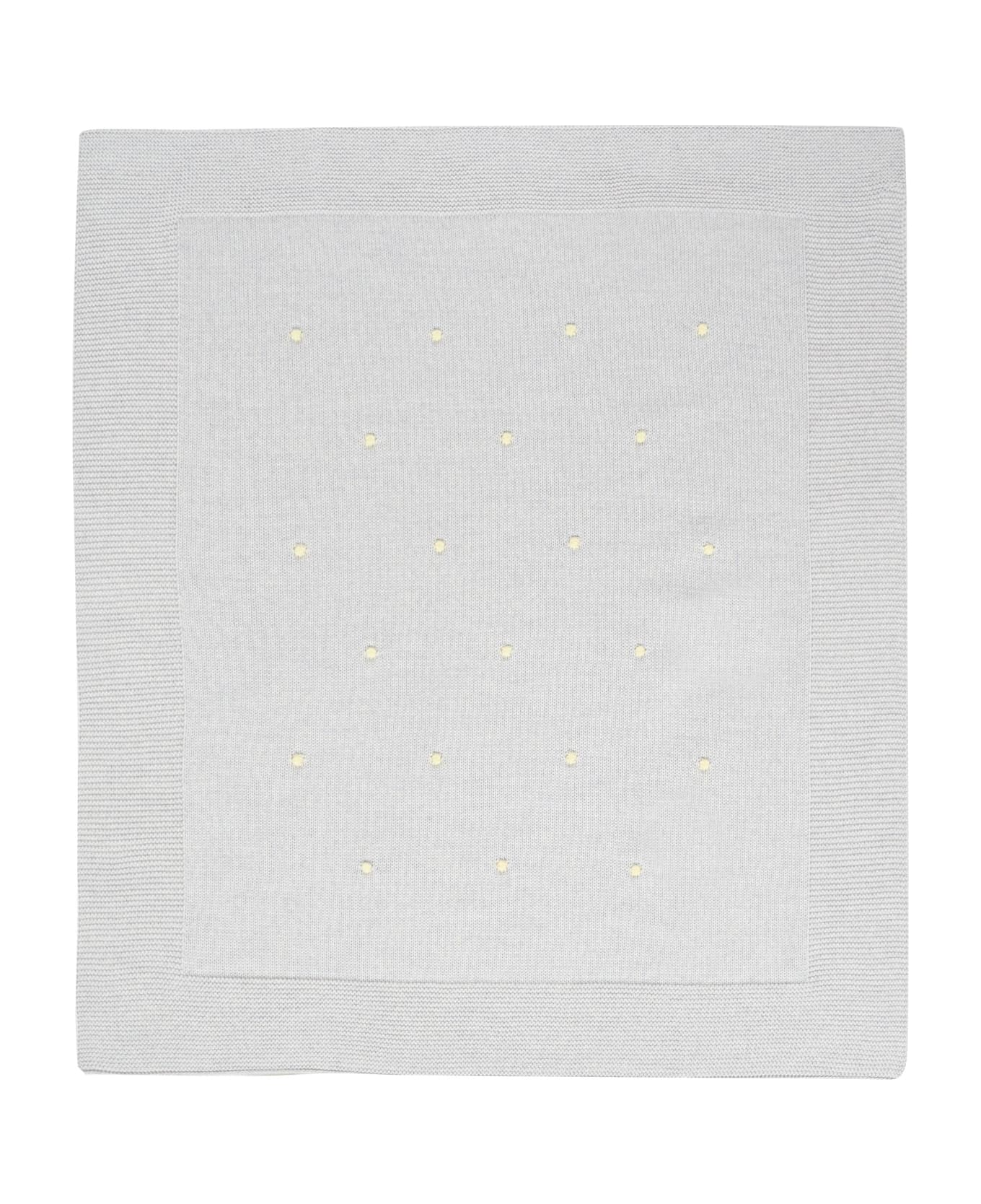 Grey virgin wool blanket, embellished with yellow polka dots embroidered on the front.