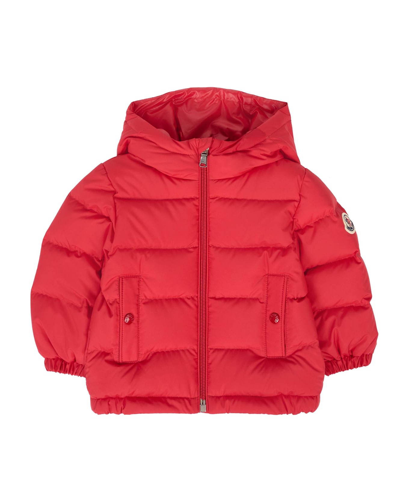 Heavyweight red quilted down jacket, with long sleeves, a hood with red, white, and black striped detail, a front zip fastening, side button pockets, and elasticated cuffs and hem. It is embellished with an iconic patch applied on the sleeve.