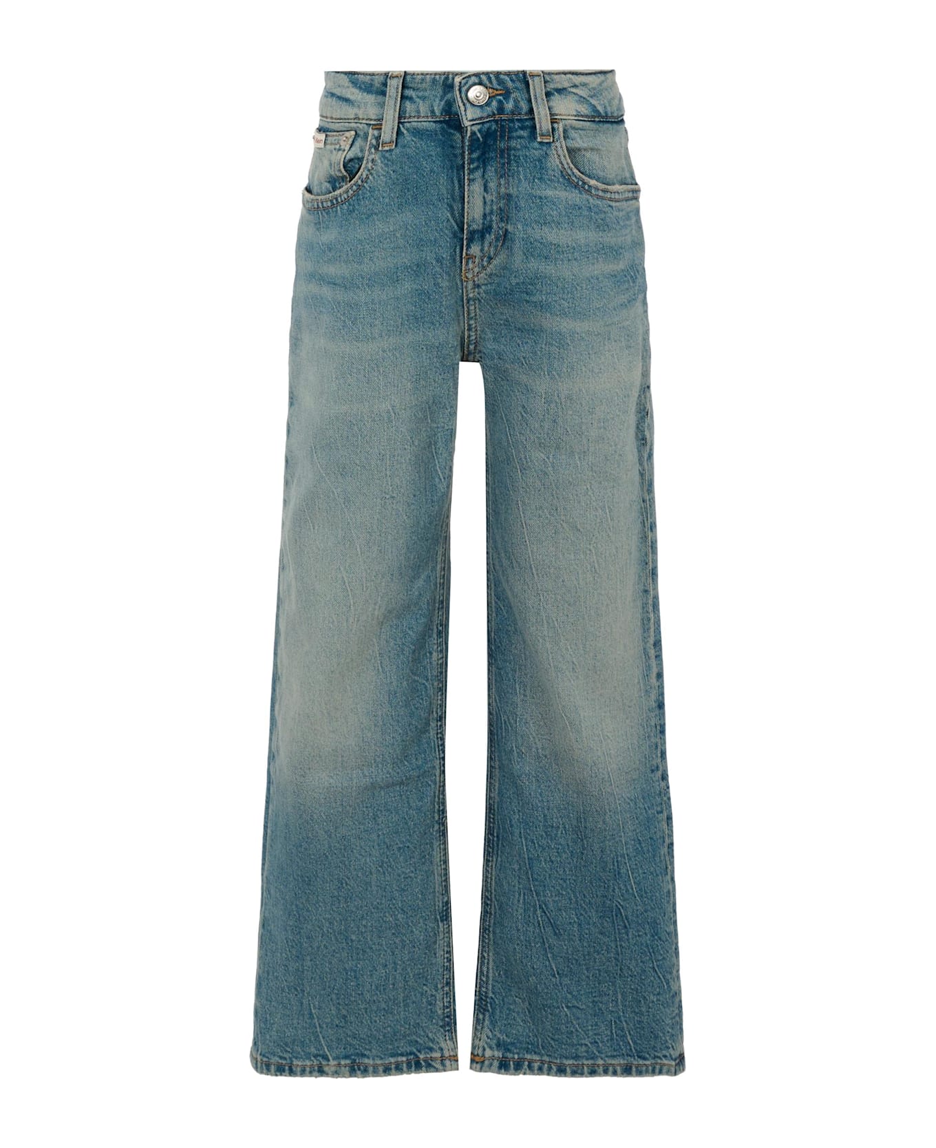 Five-pocket denim jeans, with belt loops, front zip and button fastening; the waist is adjustable thanks to an internal elastic with buttons. They are embellished with a logo patch on the front and back.