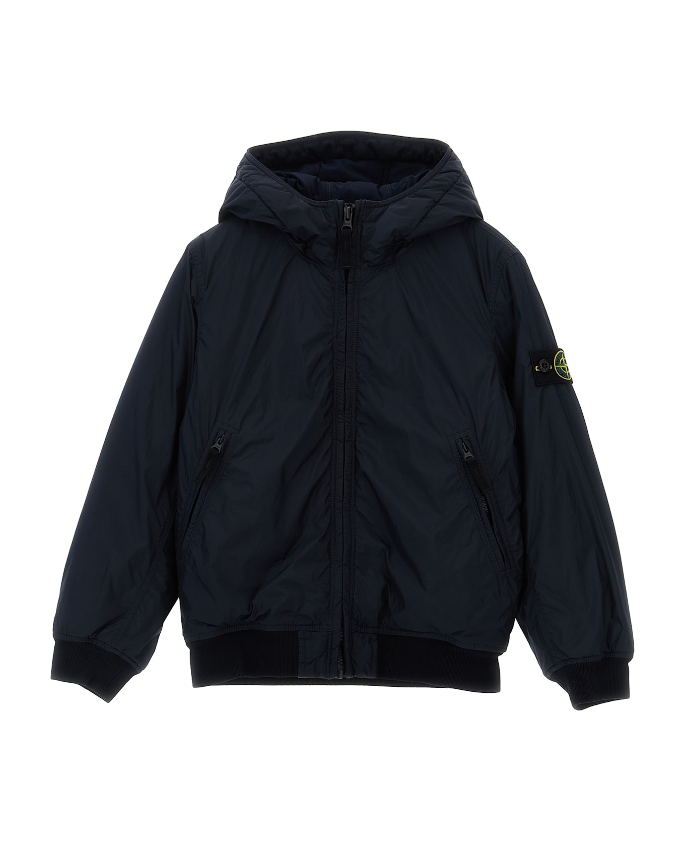 KIDS Lightly padded synthetic fabric jacket with stretch knit details, hood, front zip closure, pockets, long sleeves with elastic cuffs and logo badge. SUSTAINABLE: This product is made with recycled nylon.