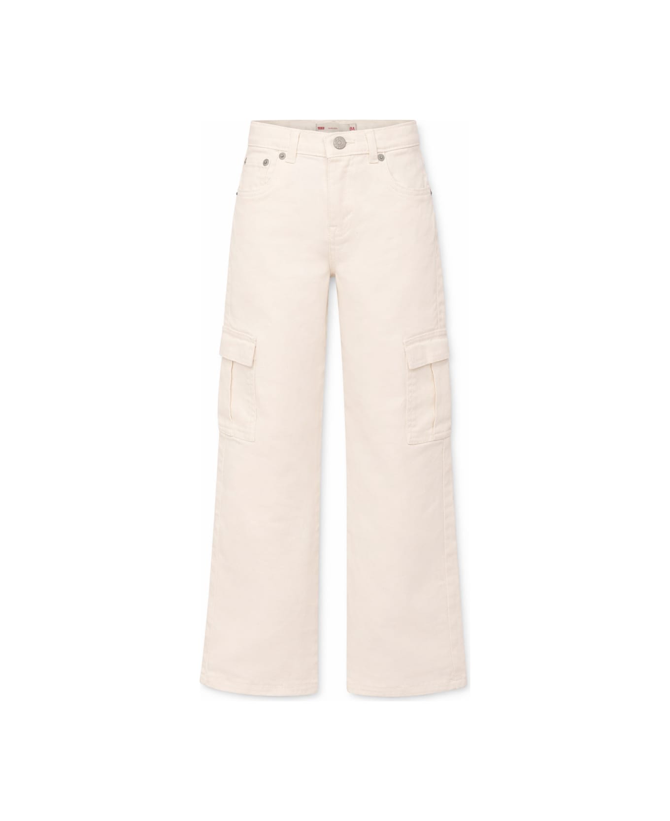 White five-pocket jeans, with belt loops, front zip and hook fastening, adjustable waist thanks to internal elastic with buttons and gargo pockets on the sides. They are embellished with a logo patch on the back.