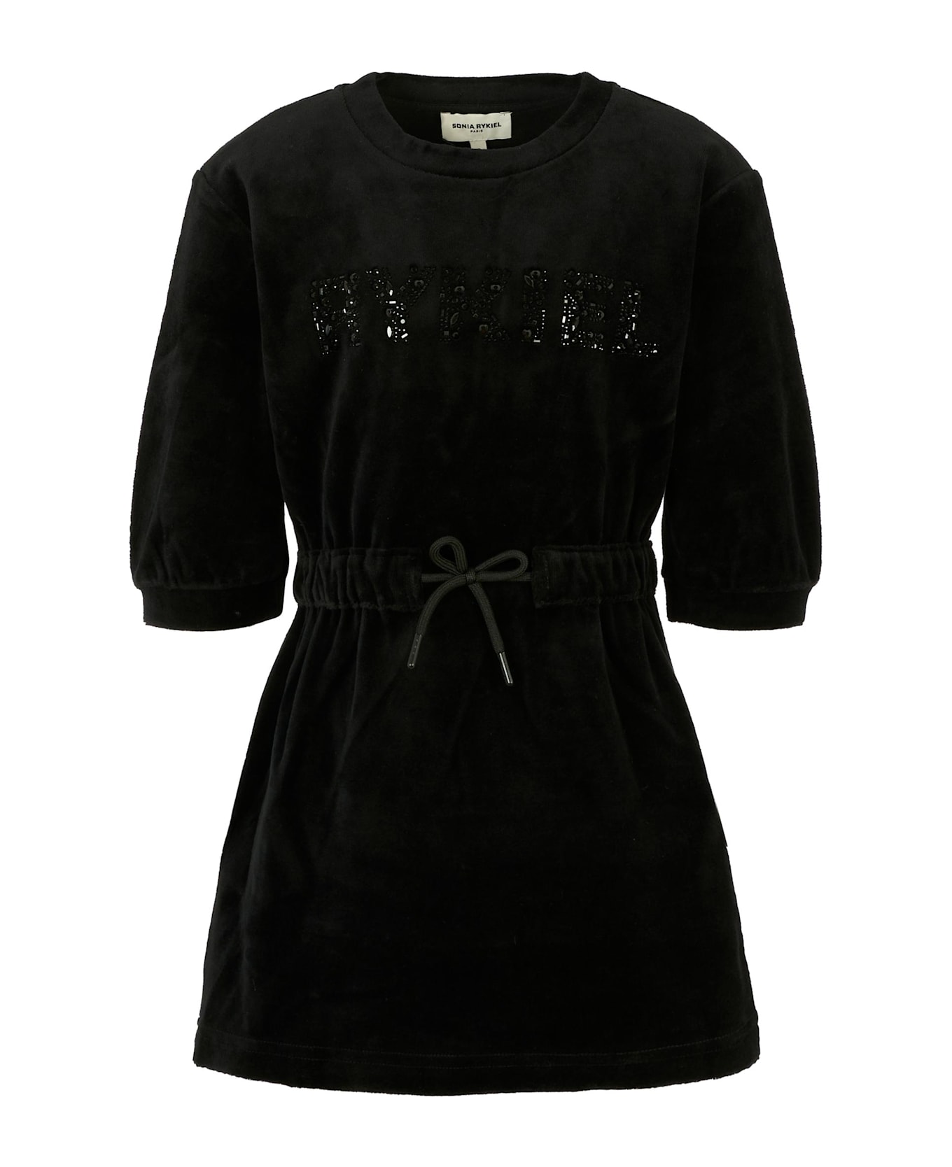 Black chenille dress, with long sleeves, a crew neck, an elasticated waistband with a drawstring. It is embellished with a rhinestone logo on the front.