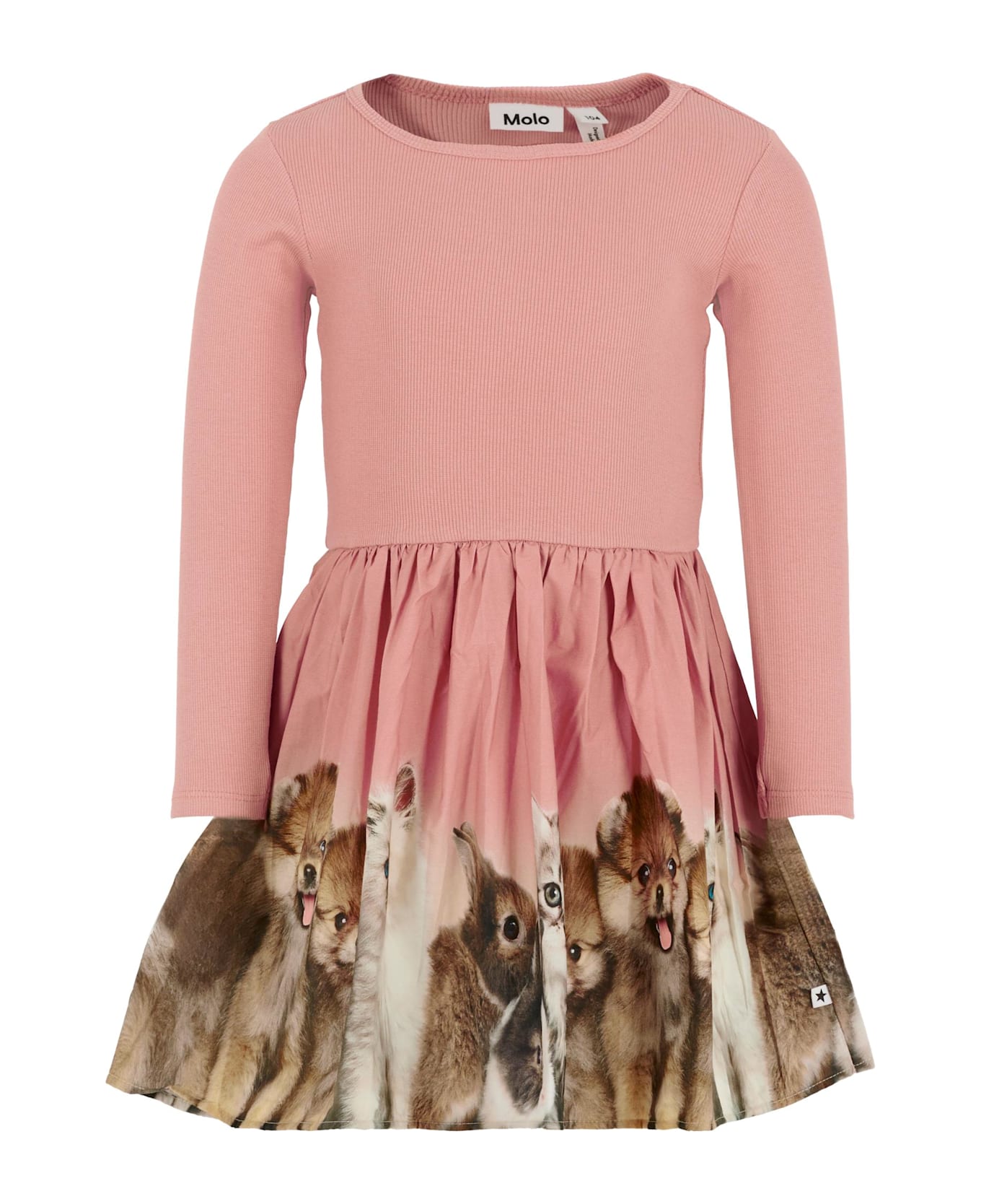 Pink GOTS-certified organic cotton blend dress with long sleeves, a crew neck, a ribbed bodice, and a poplin skirt. It is embellished with all-over animal print, on the skirt.