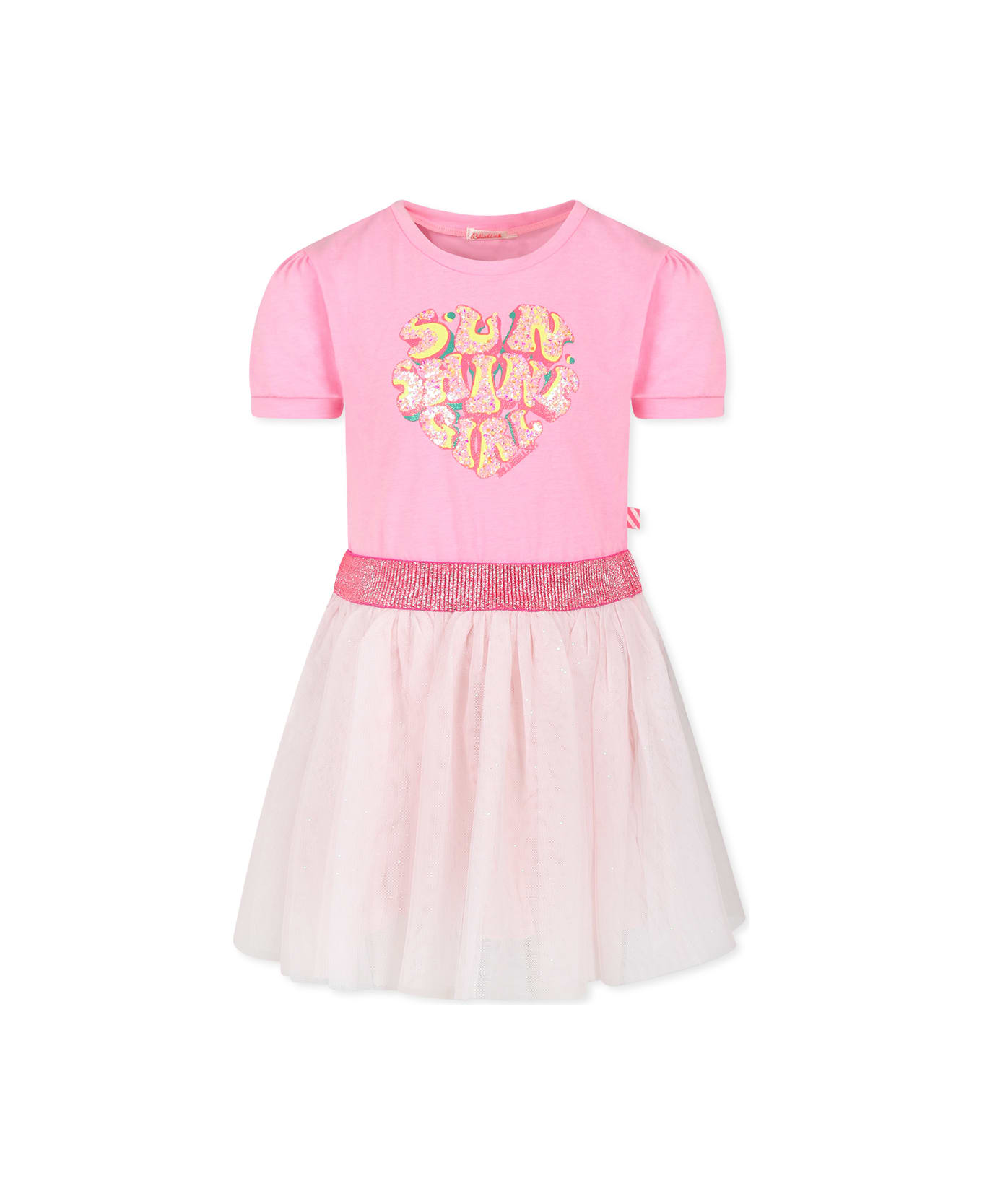 Pink short-sleeved dress, with crew neck, elasticated lurex band and tulle skirt. It is embellished with sequin heart-shaped writing on the front.
