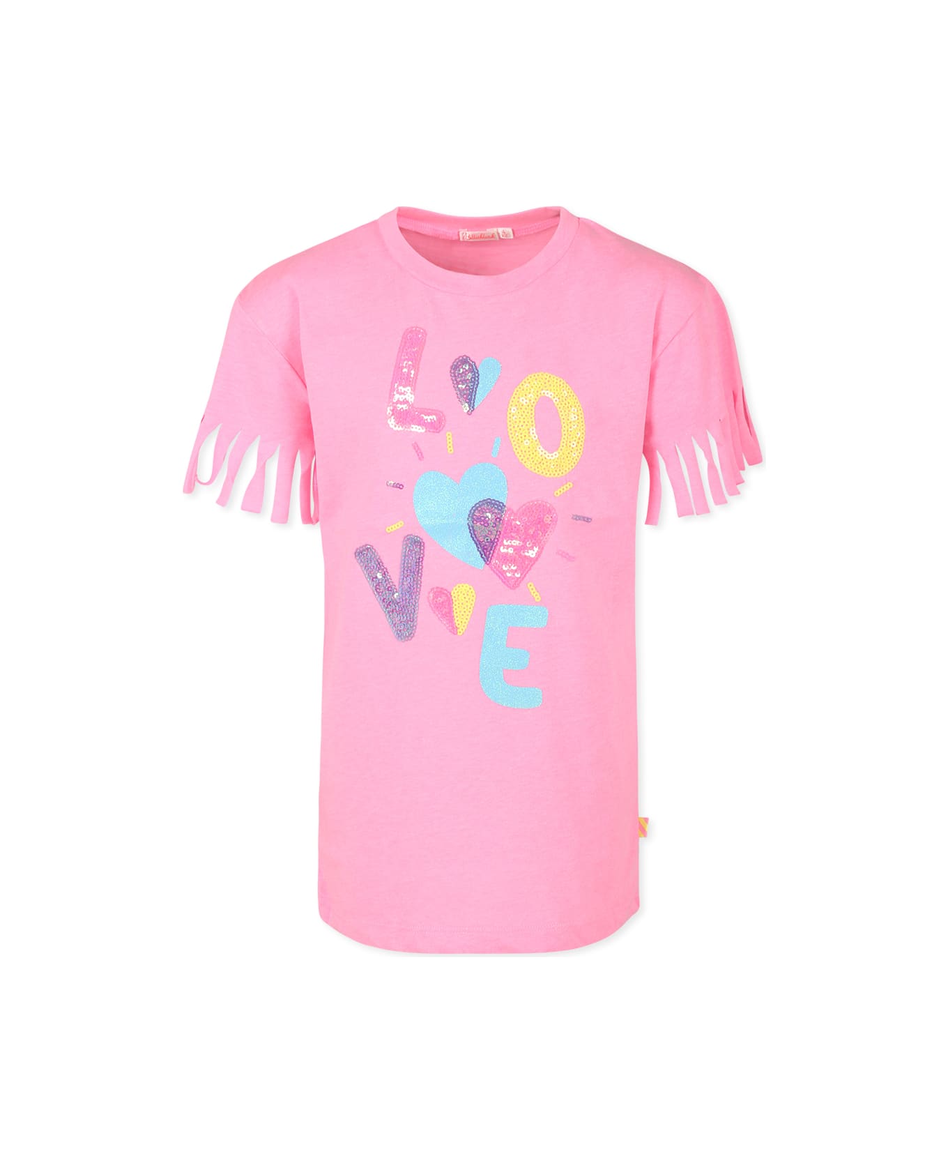 Pink cotton dress with short sleeves, ribbed crew neck and fringe details. It is embellished with "Love" writing, sequins and hearts on the front.