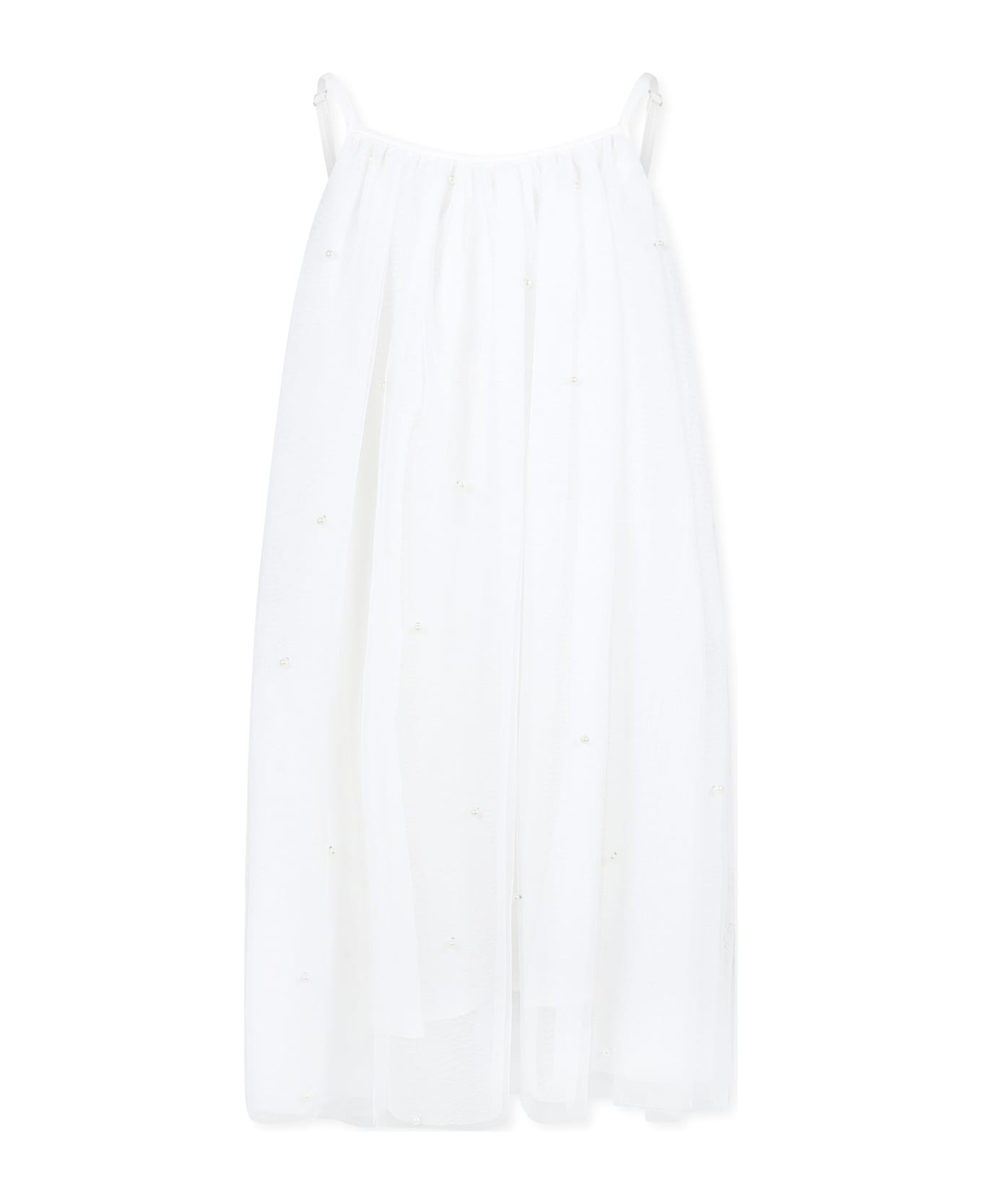 White tulle dress with adjustable straps and square neckline. It is embellished with pearls applied all-over.