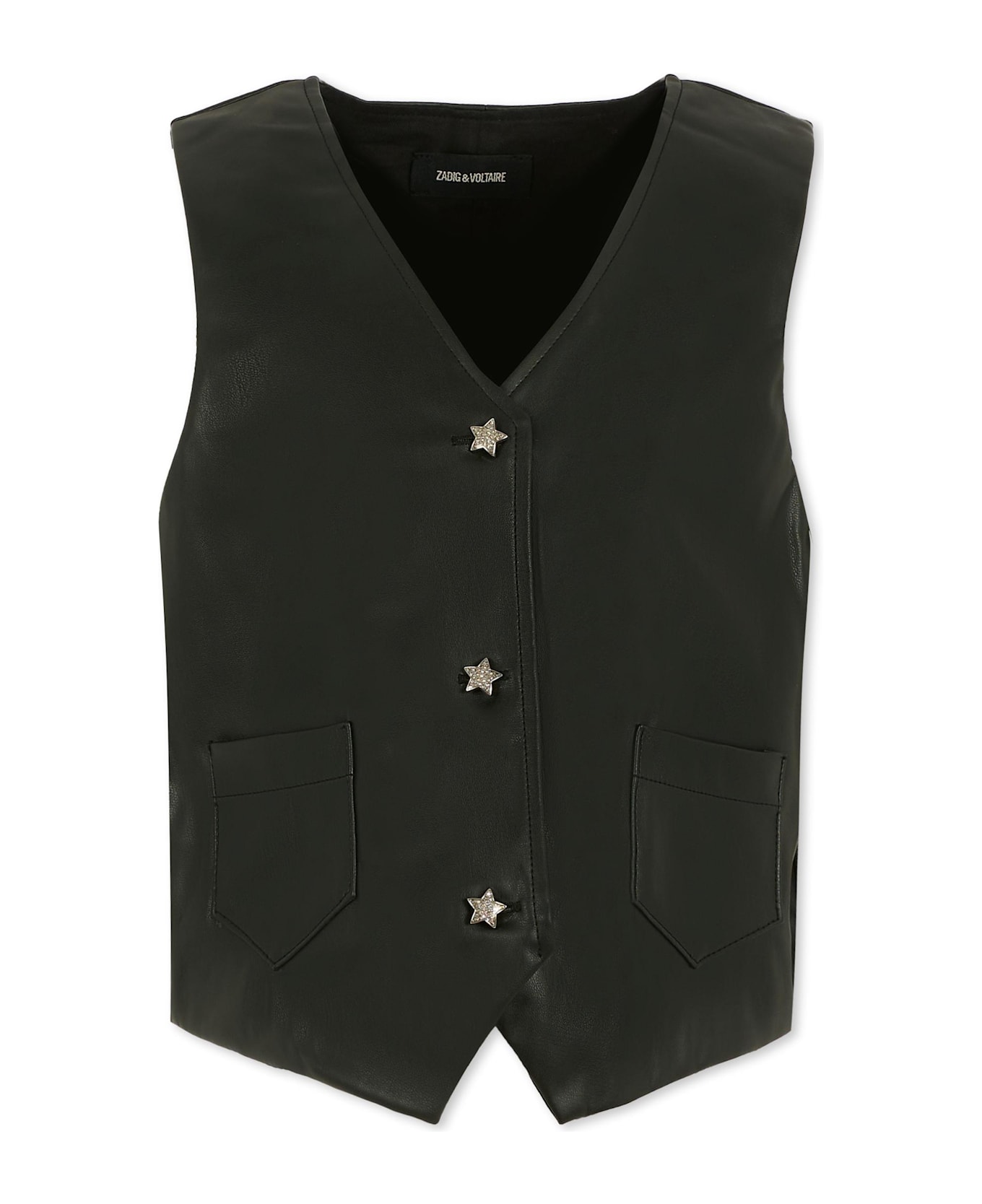 Black faux leather vest with V-neck, front fastening with rhinestone star-shaped buttons and patch pockets on the front.